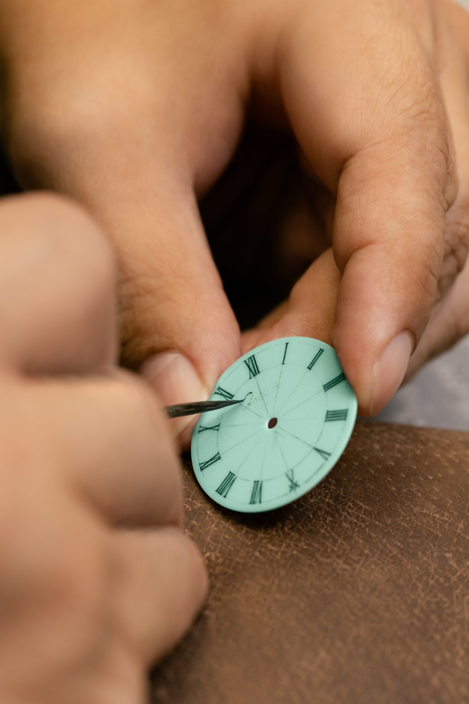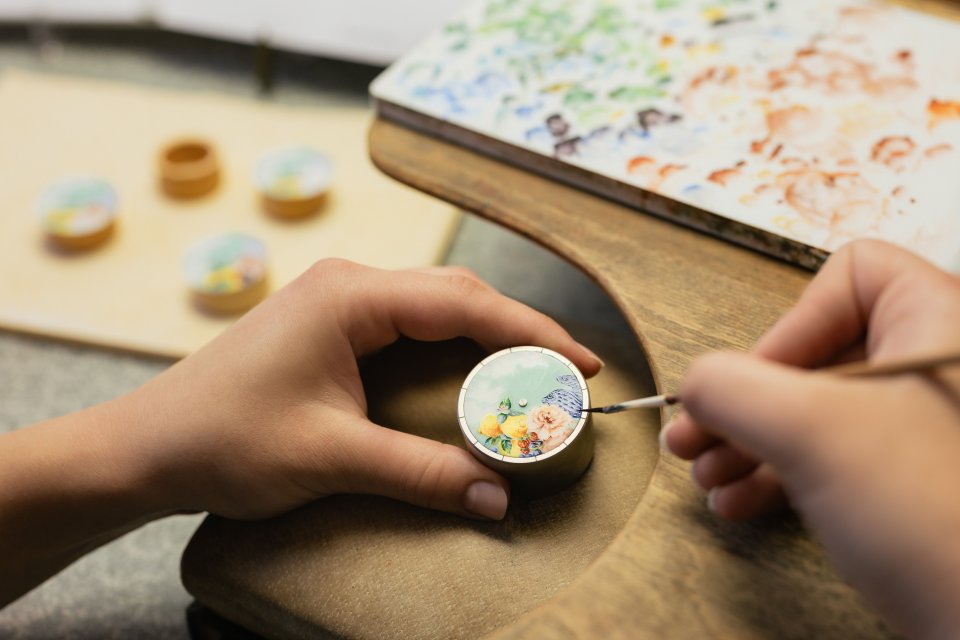 ここで、装飾や文字、ローマンインデックスが手作業で細い筆を使って何層にもわたって塗り重ねられます。深みのある色に仕上げるために、どの層も窯で 900°C で焼成されます。