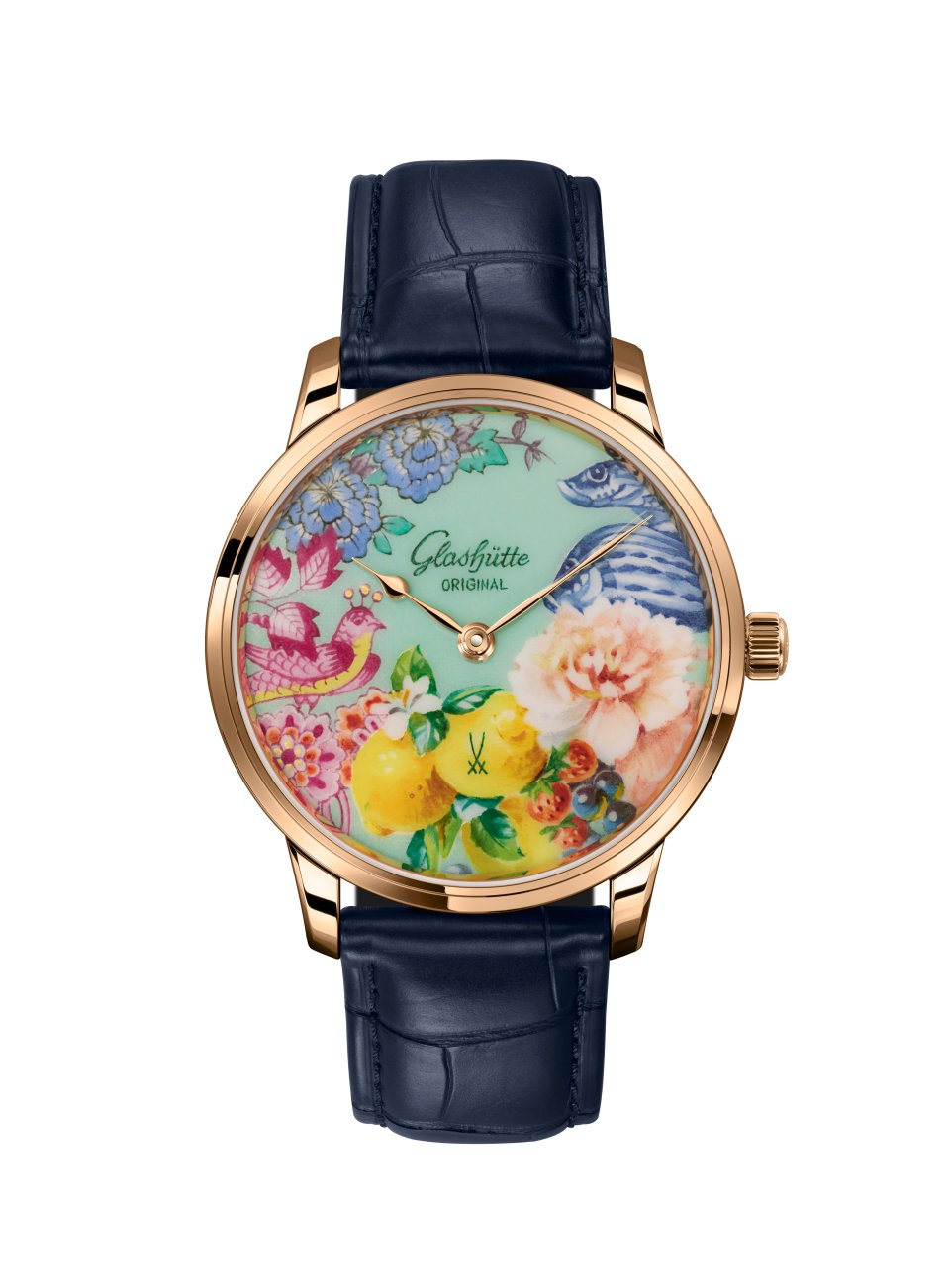 グラスヒュッテ・オリジナルとマイセン磁器製作所は、ドイツのクラフトマンシップの最高峰を代表する存在です。伝統豊かな 2 つのブランドは、それぞれがその道のスペシャリストとして、長年にわたる友情で結ばれています。この絆にインスパイアされ、両ブランドは特別なプロジェクトを取り組むことになりました。このプロジェクトにより、2つのブランドの価値が融合され、繊細な絵付けが施された磁器製文字盤に高い精度と詩情を兼ね備え、時代を超越した3種類のリミテッド・エディションが誕生しました。エレガントなレッドゴールド ケースに収められたこれらの時計は、伝統的なクラフトマンシップ、細部までこだわり抜かれた卓越した品質、そして人間の創造性への敬意を体現しています。