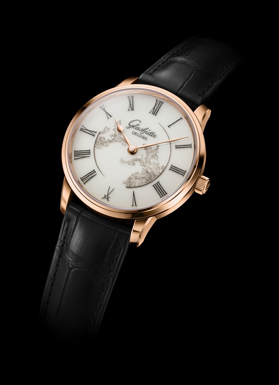 シリコン製ヒゲゼンマイは磁場や温度変化に強く、秒停止機構により、リューズを引き出すことで時刻を正確に設定できます。サファイアクリスタルのケースバックからは、ムーブメントに施された丁寧な仕上げがマイセン磁器の芸術的な美しさと見事なコントラストを成している様子を存分に眺めることができ、グラスヒュッテ 3/4 プレートの洗練されたリブ仕上げや、バランスコックの手彫り仕上げ、そして手巻きチェーンのサンバースト仕上げを堪能できます。グラスヒュッテ・オリジナルのダブル G ロゴをあしらったスケルトンローターは 21K ゴールドで、面取りとポリッシュ仕上げを施したエッジ、ポリッシュ仕上げのスティールパーツ、小さなブルースティールネジなど、細部に至るまで手作業により精緻な仕上げが施されています。