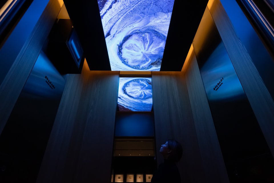 現代アーティストの中山晃子氏は、ブルガリ ホテル 東京のエレベーターをにイマ―シブ(没入型)インスタレーションを展開。グランドフロアからホテルロビー階である40階へと上昇する「時」を 地と空の間に浮いた小さな美術館として、見上げた空をテーマにした4つの映像作品を上映しています。また40階ギャラリーでは、ブルガリ・ヘリテージ・コレクションと貴重なプレイベートコレクションから厳選された作品が期間限定で展示されます。