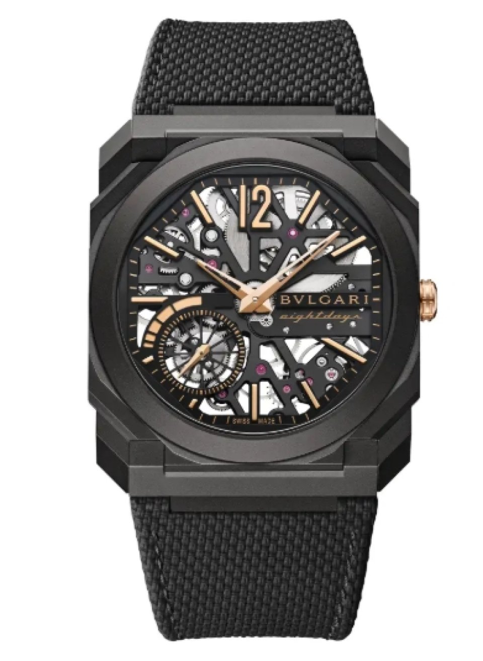 品番:104121 価格:3,938,000円税込 ケース:径40mm、5.95mm厚、超薄型DLC加工チタン製ケース、シースルーケースバック、30m防水 ダイアル:パワーリザーブインジケーターおよびスモールセコンドカウンターとBVLGARI eight daysロゴを配したスケルトンダイアル、ピンクゴールドプレート針およびインデックス ストラップ:ブラックラバー製ストラップ、DLC加工チタン製ピンバックル ムーブメント:BVL199SK、超薄型自社製手巻きムーブメント、2.5mm厚、ブラックPVDスケルトンブリッジ、時/分/秒表示、パワーリザーブインジケーター、192時間(8日間)パワーリザーブ、21,600振動