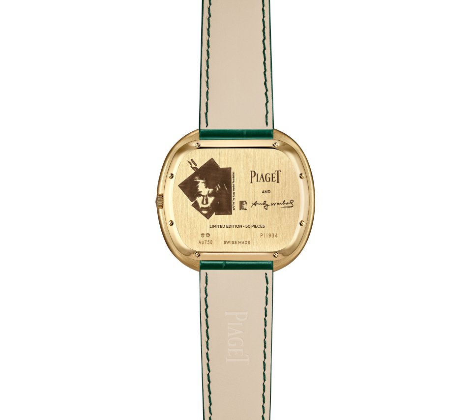 ケースバックには文字盤デザインのベースとなったアンディ・ウォーホルの自画像がエングレービングされ、ピアジェのロゴとウォーホルのサインが刻まれています。まさにコレクター垂涎の逸品です。