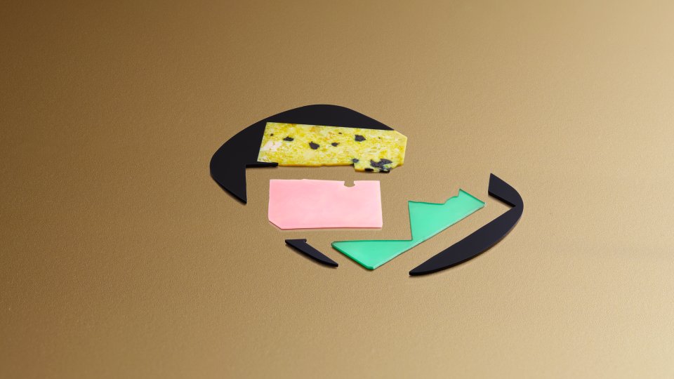 アンディ・ウォーホル ウォッチ「コラージュ」リミテッドエディションの文字盤のモチーフは、古くから伝わるメティエ・ダールのマルケトリ技法により、4種類のオーナメンタルストーンを丁寧に成形、カット、配置して製作されます。ベースには、1973年にウォーホル自身が所有していたウォッチと同様に、ブラックオニキスが使用されています。その上に、ナミビア産のイエローサーペンティン、ピンクオパール、グリーンクリソプレーズを薄くスライスしたものが組み合わされています。これらが、段差のある45mmの18Kイエローゴールド製ケースに収められ、深みのある落ち着いた色合いのグリーンレザーストラップが文字盤の美しさを引き立てながら、調和のとれたカラーパレットを完成させます。