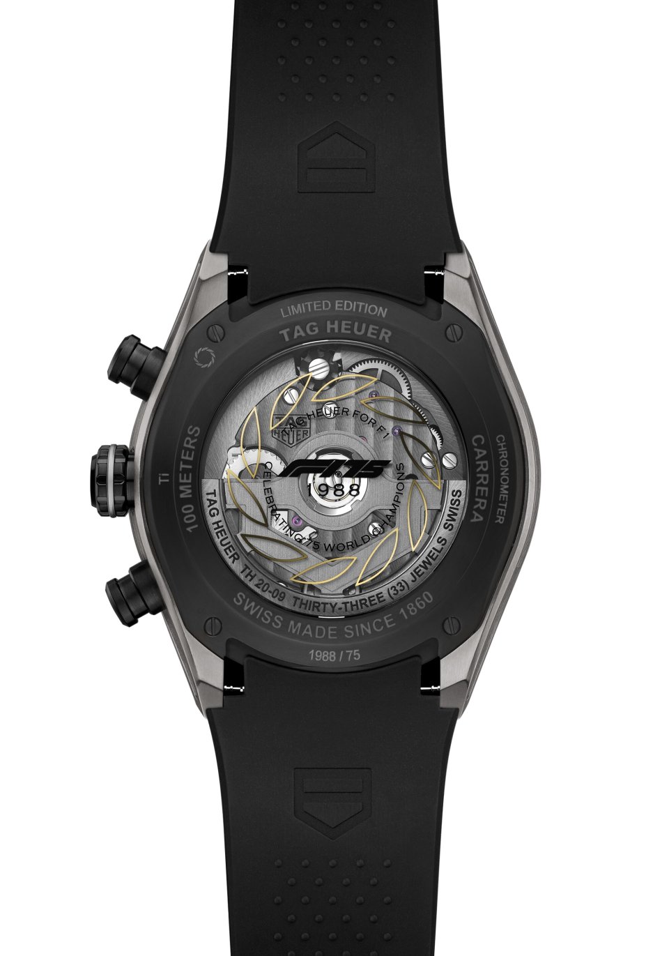 さらに、タキメーターの12時位置にシルバーのF1®ロゴを、75の目盛りにはシルバーの公式F1® 75周年記念ロゴを配し、ベゼルとケースバックにも目立つようにあしらうことで、75人のF1®ワールドチャンピオンとのつながりを表現しています。