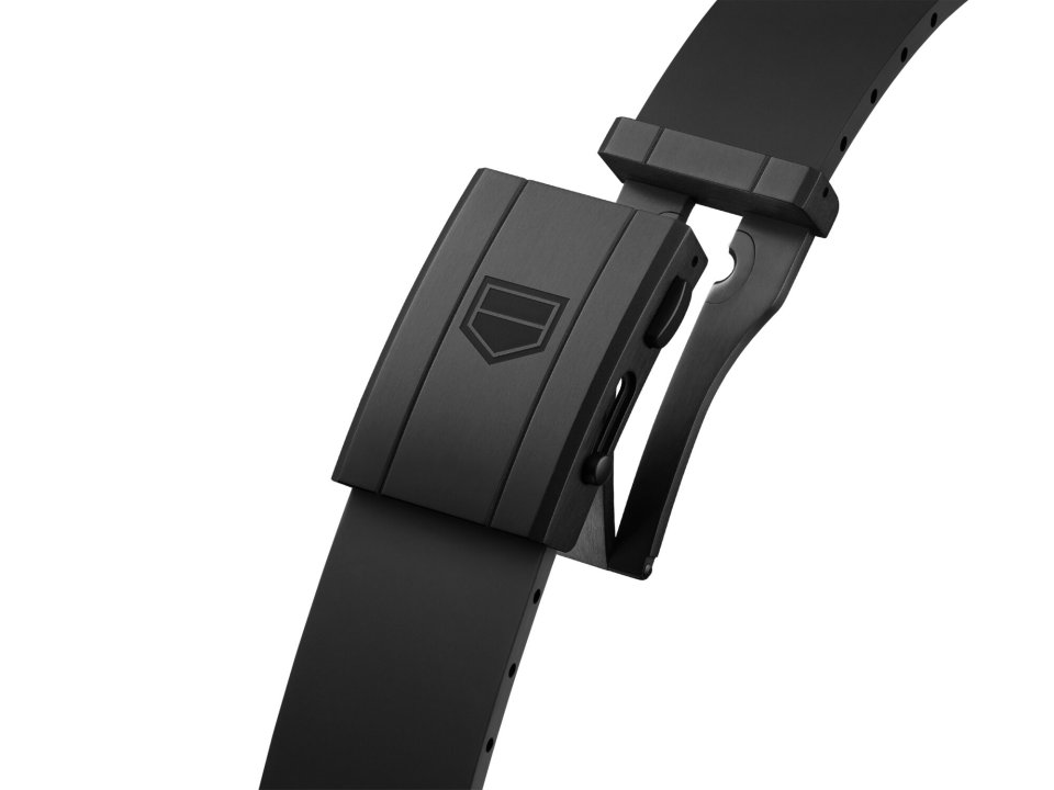 また、一体型のブラックラバーストラップと、それにマッチするブラックDLCコーティングのチタン製バックルが、快適でスポーティーなフィット感を実現。このタイムピースのパフォーマンス志向のデザインを絶妙に引き立てています。