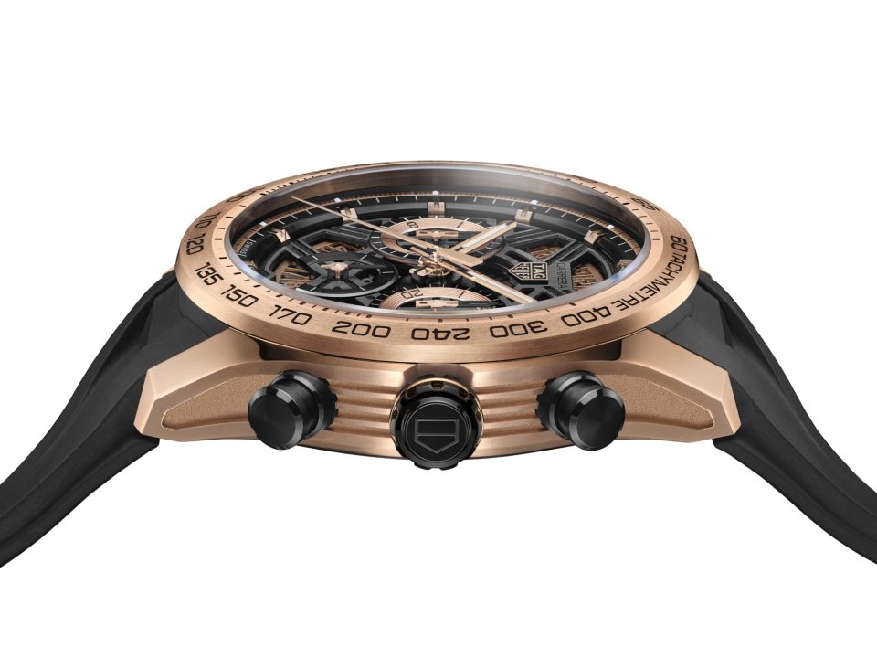 オープンワークダイヤルにも同様のアプローチが反映されています。針やサブカウンターから、フランジ、日付ディスクに至るまで、主要な視覚要素はすべてローズゴールドで緻密に仕上げられることによって、豊かで統一感のある構成が生み出されています。中心にはタグ・ホイヤー シールドが配され、周囲の透明効果によって、内部のムーブメントが顔を覗かせ、精密なメカニズムの美しさを際立たせています。