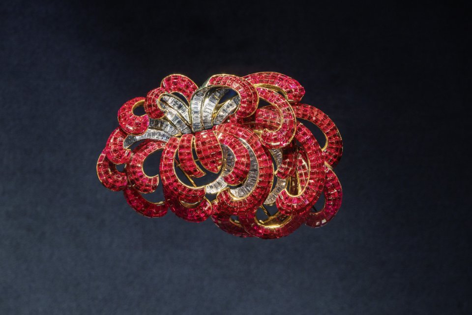 クリサンセマム クリップ 1937年 プラチナ、イエローゴールド、ミステリーセット ルビー、ダイヤモンド ©Van Cleef & Arpels