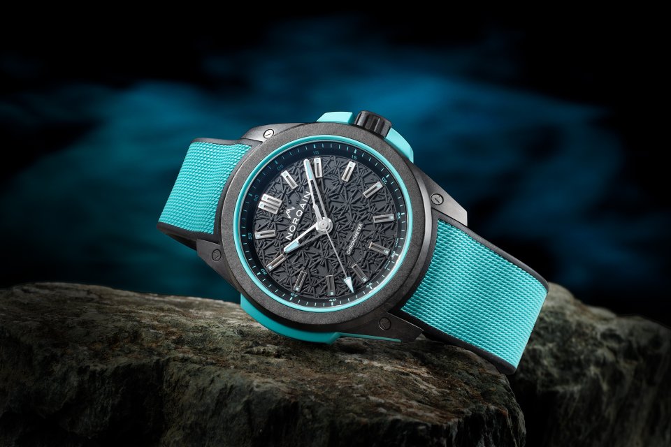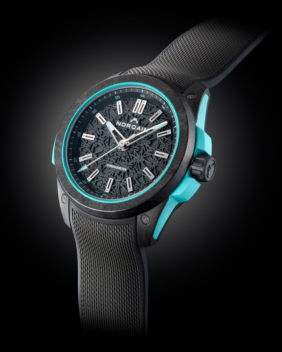ケース素材には、ノルケインが独自開発したカーボン複合素材「ノルテック」を採用。非常に軽量でありながら、大理石のような独特の模様を持つこの素材のマットな質感は、小歩危の削られた岩肌の荒々しさを彷彿とさせます。また、交換用に付属するターコイズとダークグレーカラーのラバーストラップを付け替えることで、アクティブなシーンではカジュアルに、日常ではシックに、多彩な表情をお楽しみいただけます。