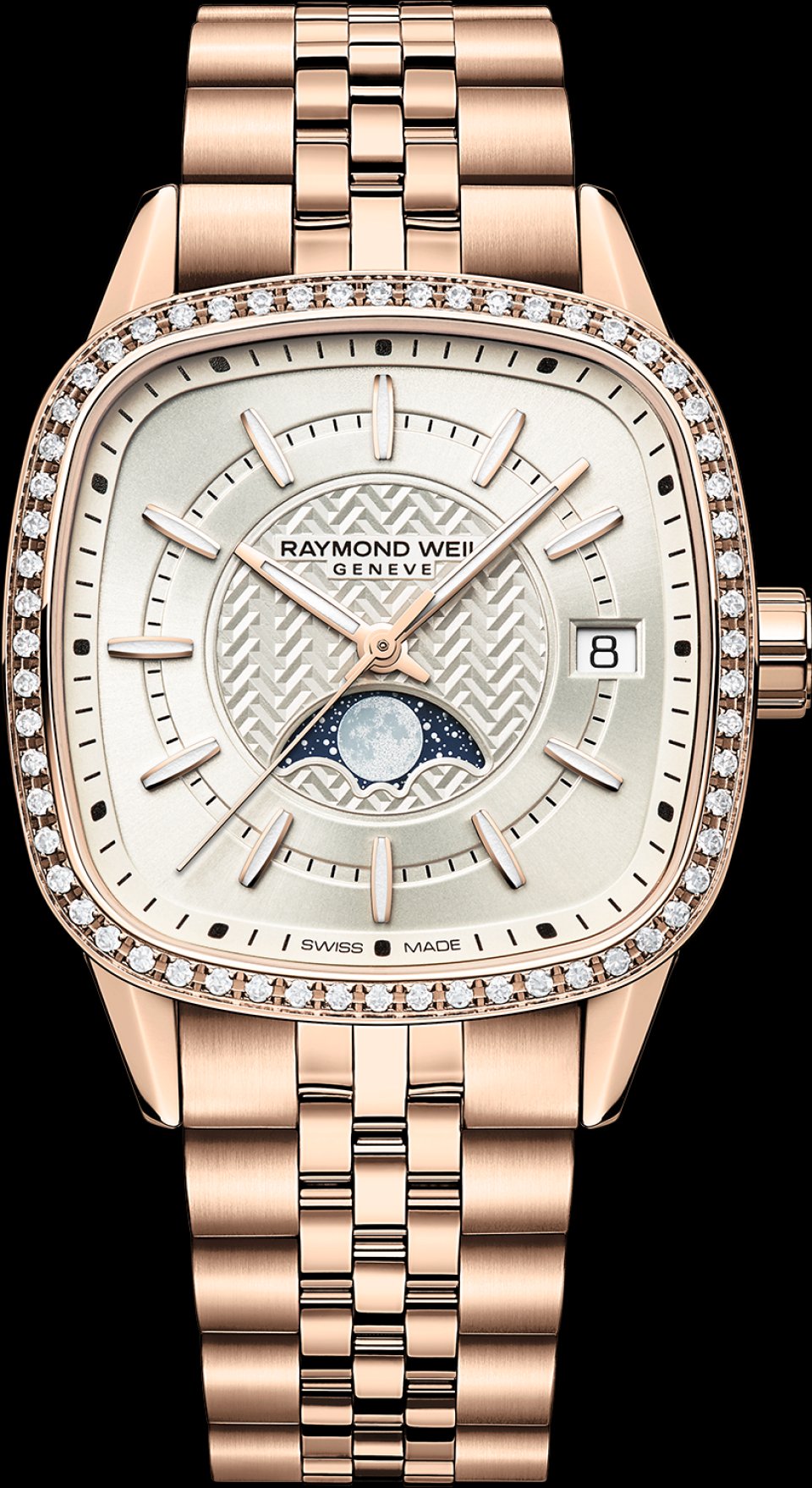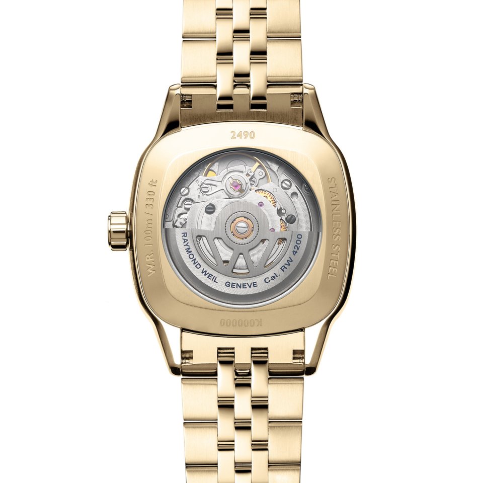 ゴールドPVDのステンレススティールブレスレットもしくはベージュのカーフレザーストラップを装備。ステンレススティールブレスレットは、ケース同様に2種類の仕上げを使い分けたドレッシーな5連仕様で、細かいコマが手首の形状に沿うことで快適な装着感を提供します。カーフレザーストラップは、レイモンド ウェイルのイニシャルを象ったW字型のステッチが個性的で、ゴールドケースとマッチして柔らかい雰囲気をまといます。
