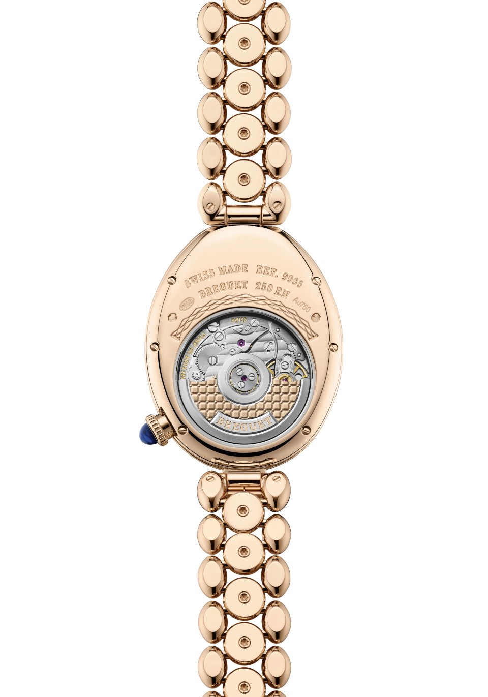 ブレゲゴールドを初めて用いた「レーヌ・ドゥ・ナープル 9935」のケースは、センターラグが備わり、6時位置のこの丸いラグにダイヤモンドがスノーセッティングされています。新しいブレスレットのリンクは、このラグのフォルムから想を得てデザインされました。