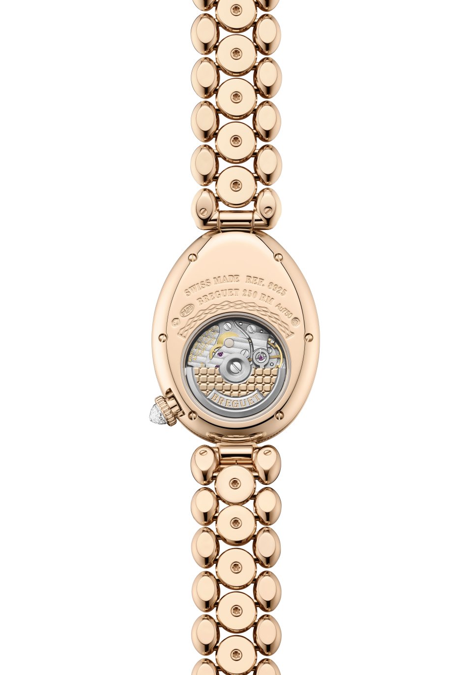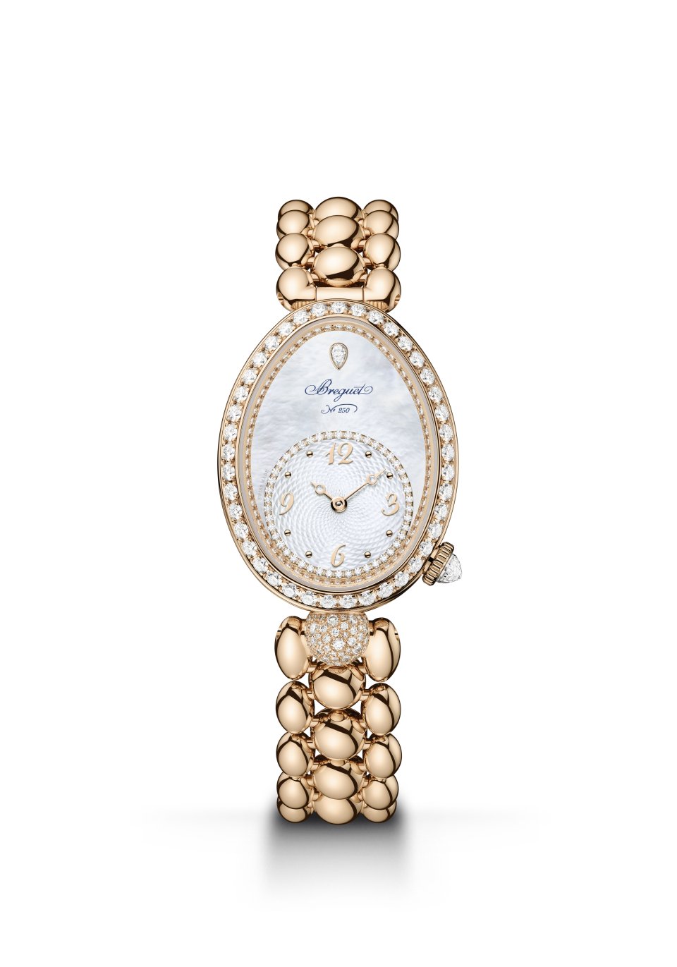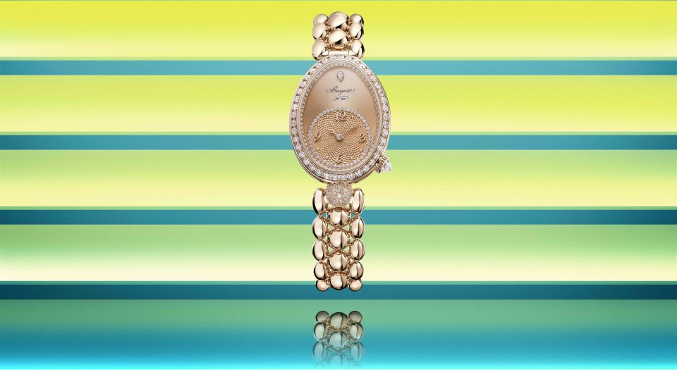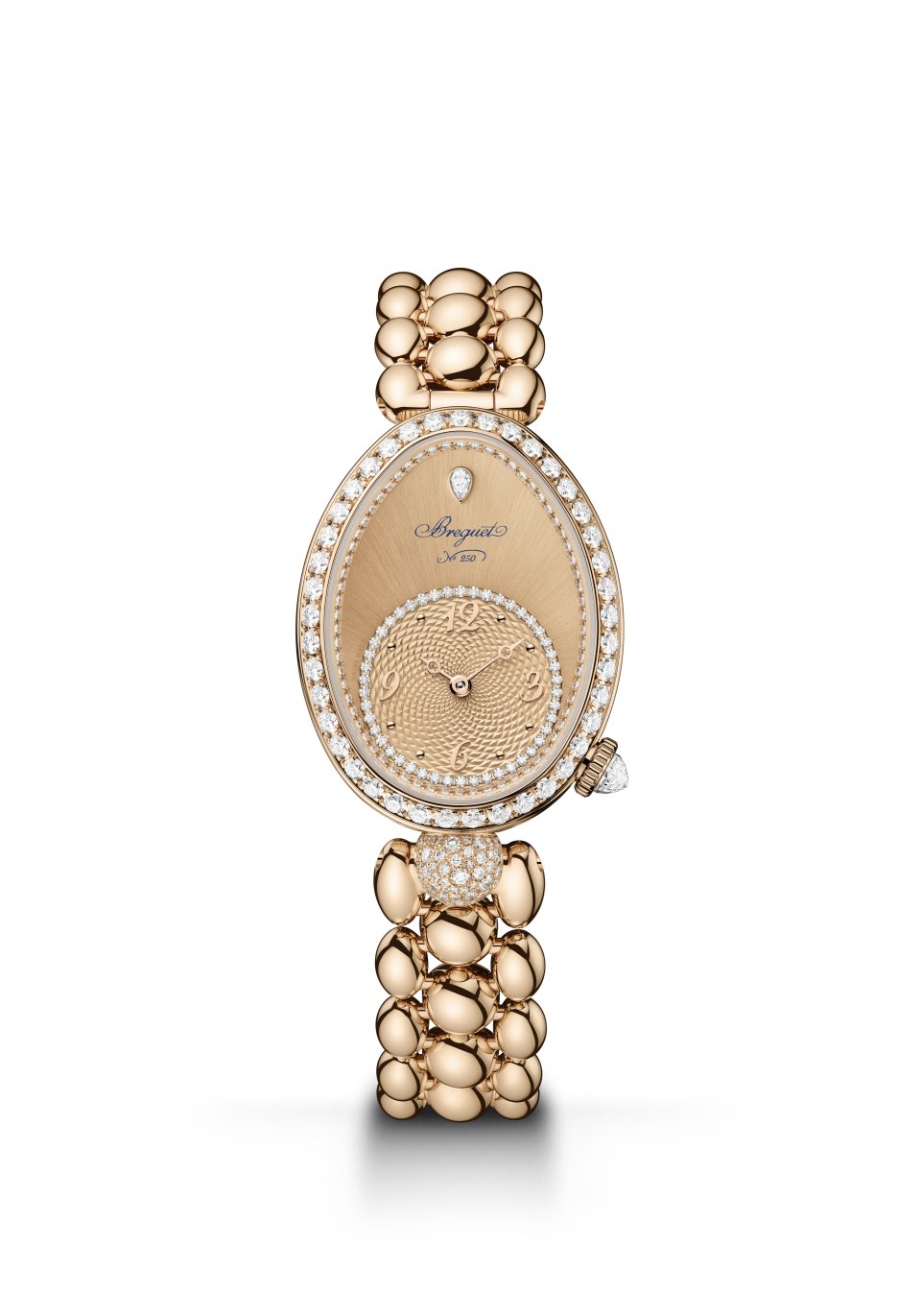 レーヌ・ドゥ・ナープル 8925。キャリバー586/1。ケース:縦33mm×横25mm、18Kブレゲゴールド製、ケースバンドにフルート装飾(コインエッジ)。文字盤:18Kブレゲゴールド製、手作業による「ケ・ド・ロルロージュ」模様のギヨシェ彫り、18Kブレゲゴールド製のブレゲ数字とインデックス、先端に穴が開いたモチーフを配した18Kブレゲゴールド製ブレゲ針(時針・分針)、12時位置にペアシェイプのダイヤモンド、チャプターリングにダイヤモンド46個、ベゼルとフランジに107個のブリリアントカット・ダイヤモンド、6時位置の丸いセンターラグに52個のブリリアントカット・ダイヤモンドをスノーセッティング、リュウズにブリオレットカット・ダイヤモンド。18Kブレゲゴールド製ブレスレット。