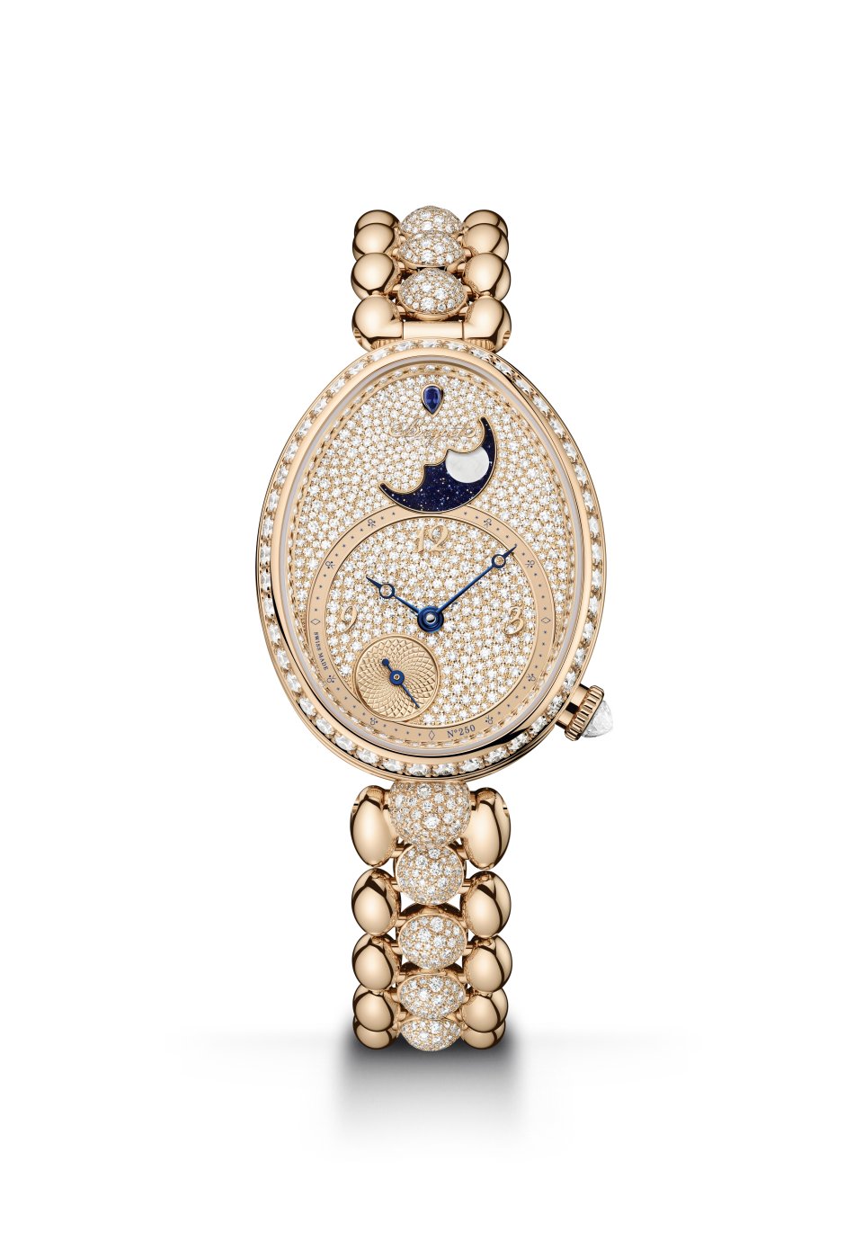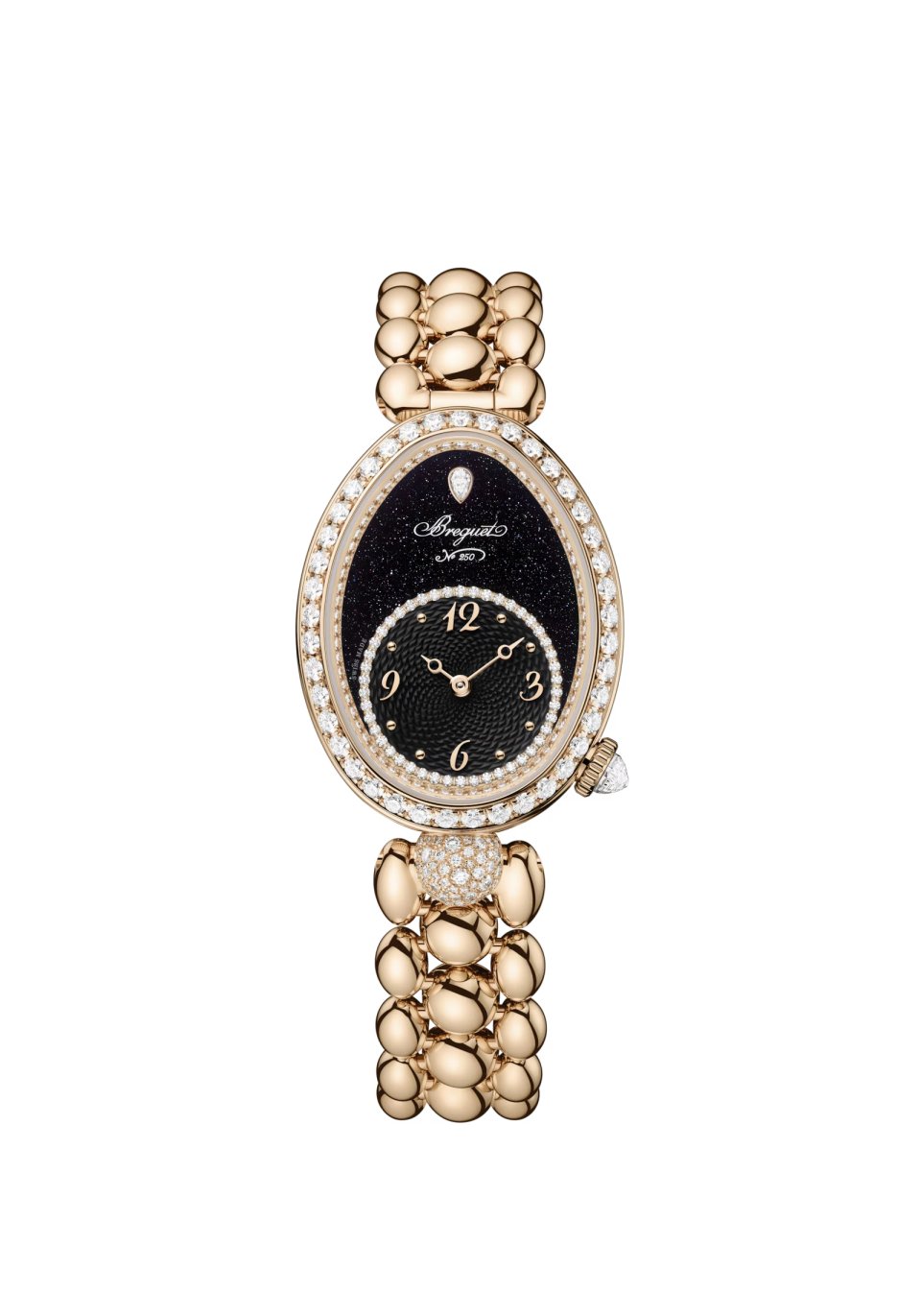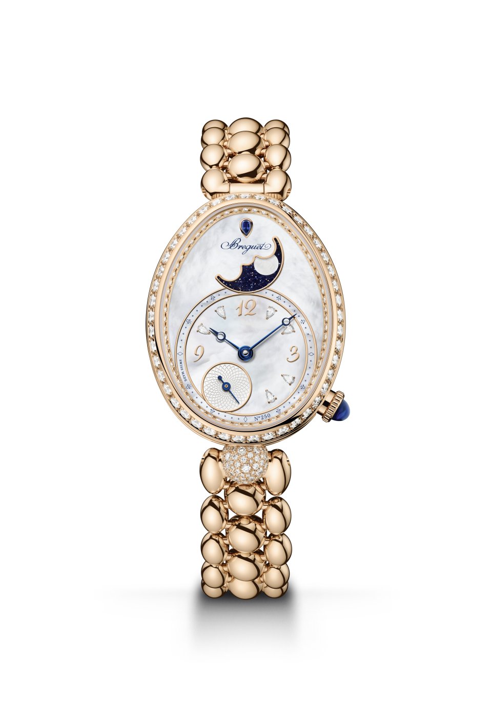 レーヌ・ドゥ・ナープル 8925。キャリバー586/1。ケース:縦33mm×横25mm、18Kブレゲゴールド製、ケースバンドにフルート装飾(コインエッジ)。文字盤:18Kブレゲゴールド製、手作業による「ケ・ド・ロルロージュ」模様のギヨシェ彫り、18Kブレゲゴールド製のブレゲ数字とインデックス、先端に穴が開いたモチーフを配した18Kブレゲゴールド製ブレゲ針(時針・分針)、12時位置にペアシェイプのダイヤモンド、チャプターリングにダイヤモンド46個、ベゼルとフランジに107個のブリリアントカット・ダイヤモンド、6時位置の丸いセンターラグに52個のブリリアントカット・ダイヤモンドをスノーセッティング、リュウズにブリオレットカット・ダイヤモンド。18Kブレゲゴールド製ブレスレット。