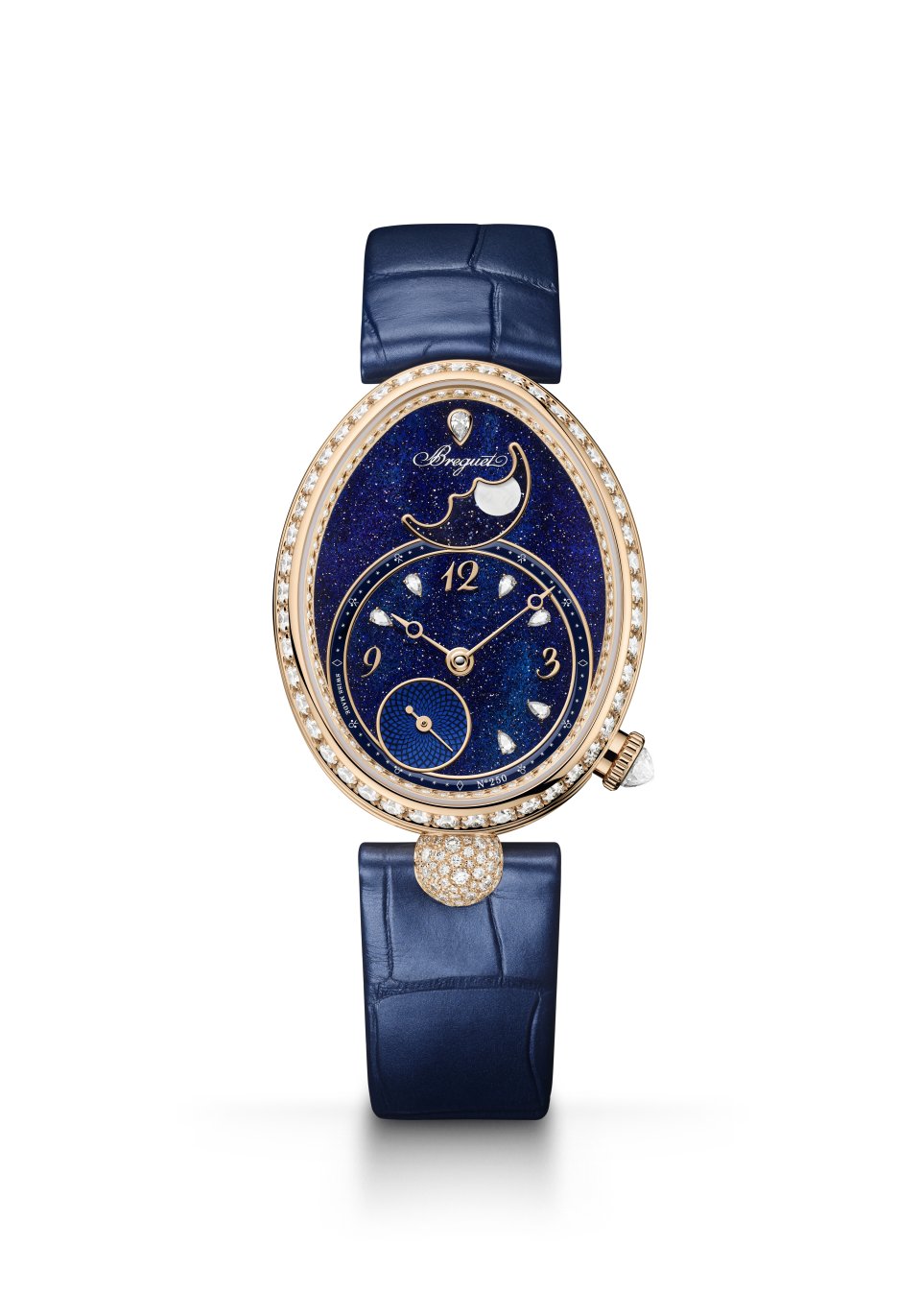 レーヌ・ドゥ・ナープル 9935。キャリバー 537L2。ケース:縦36.5mm×横28.45mm、18Kブレゲゴールド製、ケースバンドにフルート装飾(コインエッジ)。文字盤:タヒチ産マザーオブパールとアベンチュリンガラス、スモールセコンドダイヤルに手作業による「ケ・ド・ロルロージュ」模様のギヨシェ彫り、18Kブレゲゴールド製のブレゲ数字を配したチャプターリングに6個のペアカット・ダイヤモンドをセッティング。時分針に18Kブレゲゴールド製のブレゲ針、18Kブレゲゴールド製秒針、アベンチュリンガラスの夜空に新しい“シークレットサイン”の施されたポリッシュ仕上げの白い月を配したムーンフェイズ、12時位置にペアシェイプのダイヤモンド、ベゼルとフランジに109個のブリリアントカット・ダイヤモンド、6時位置の丸いセンターラグに52個のブリリアントカット・ダイヤモンドをスノーセッティング、リュウズにブリオレットカット・ダイヤモンド。ストラップ:アリゲーターレザー。