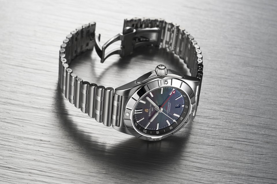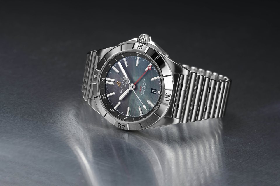 このジャパンリミテッドエディションでは、ブラックのマザーオブパールダイヤルにゴールドのブライトリング“B”ロゴをあしらい、実用性と真珠母貝の自然な美しさ、唯一性を融合させています。赤いGMT針が24時間スケール上で際立ち、第2タイムゾーンを容易に読み取ることができ、昼夜の区別も直感的に把握できます。
