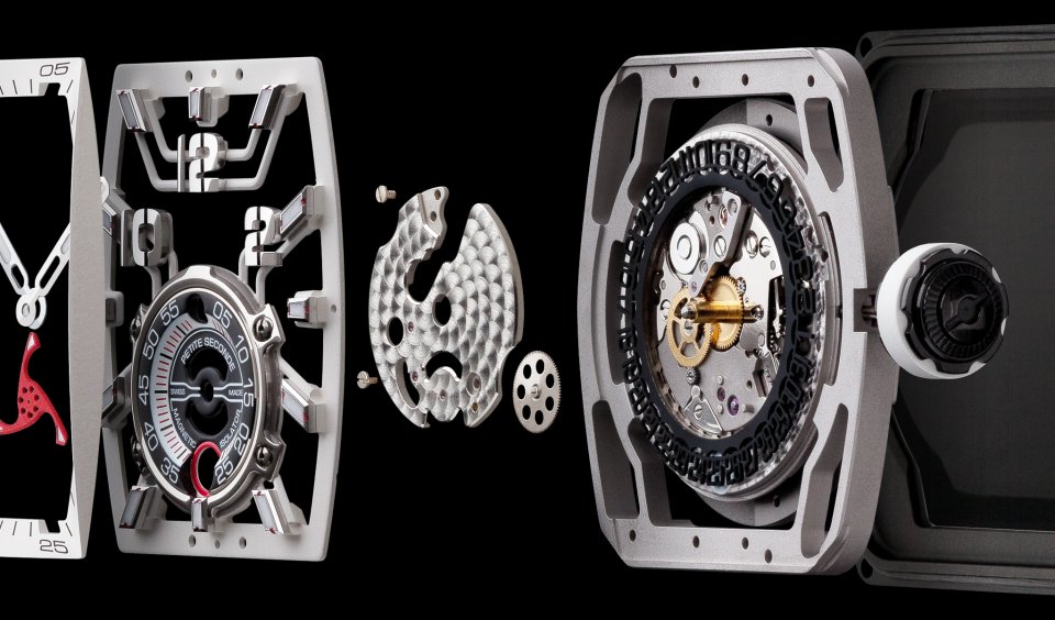 古典的な技術の応用と最先端のテクノロジーは、時計の内部においても発揮されています。スモールセコンドの立体的なメカニズムを実現させるため、ムーブメントには計算された設計がなされています。