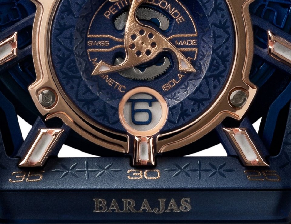 航空機の構造美と軽量性を追求した「チャレンジ ジェットライナーⅡ P-S オートマティック」は、ステンレススティールケースにネイビーブルーコーティングを施し、18Kレッドゴールドパーツを贅沢に組み合わせています。12時位置にはテキーラ バラハスのロゴが配され、文字盤の見返し部分やスモールセコンドの周囲といったディテールにテキーラ バラハスの伝統的な模様を施すことで、革新性と意匠美が見事に融合し唯一無二の存在感を放ちます。