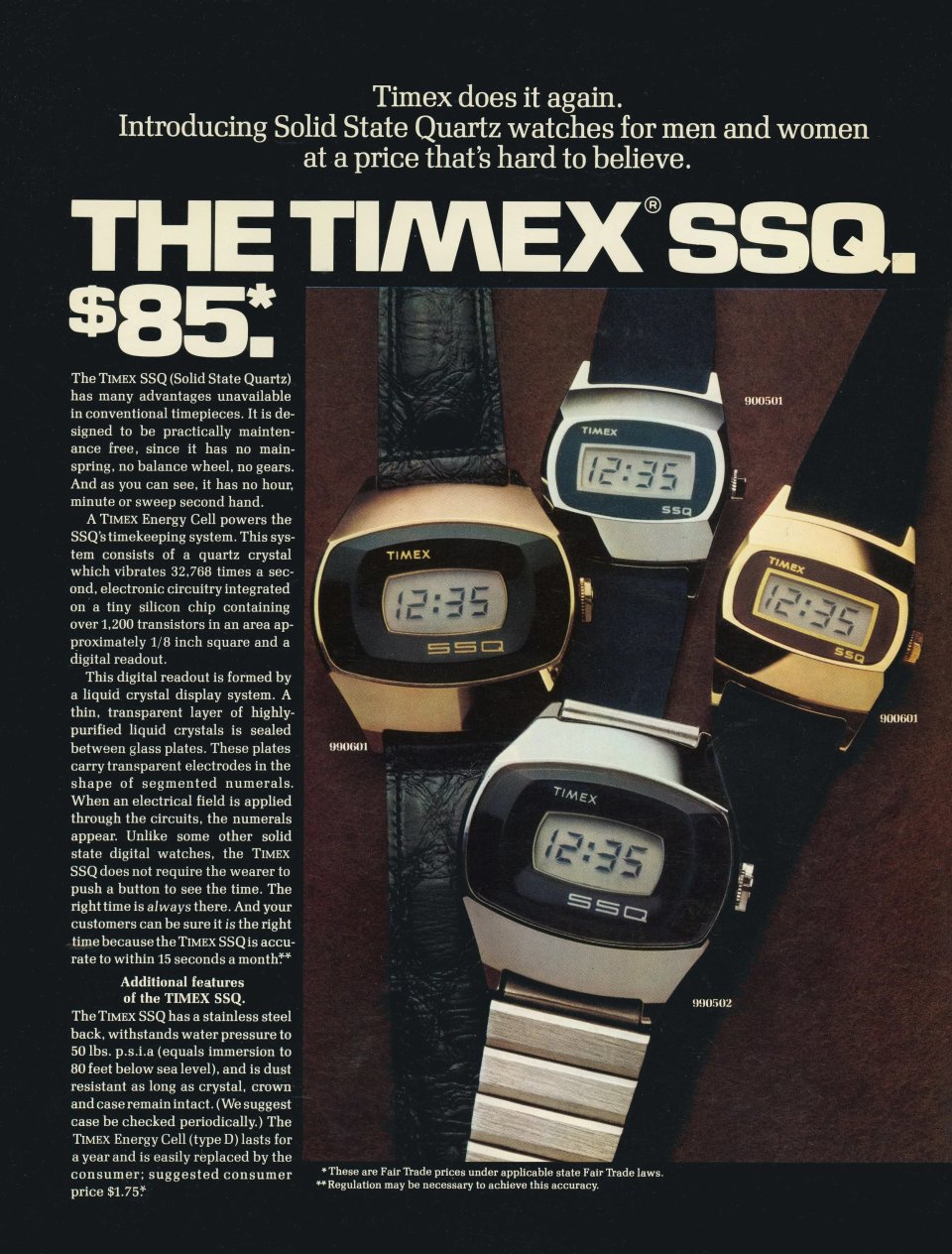 もちろんタイメックスも例外ではなく、当時最先端で人気もうなぎのぼりだったデジタルウォッチ需要に応えて1975年に『SSQ』をリリース。独特で凝ったケースフォルムとデザイン、さらに85ドルという当時のクォーツ時計の価格帯を考えても抜群のコストパフォーマンスで一躍話題となりました。