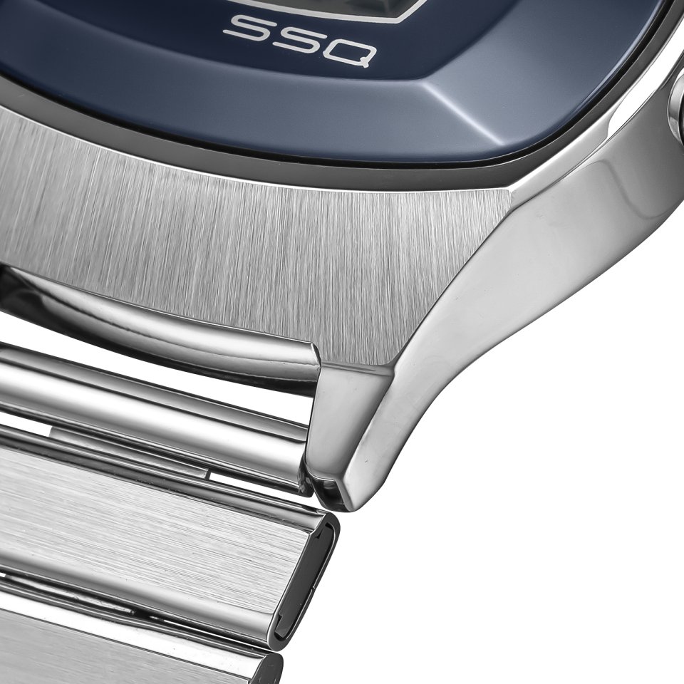 液晶周りにはコンケーブした樹脂製のパーツをはめ込み、そこにブランドロゴのほかに当時最先端技術だったSSQ[訳注:Solid State Quartzの略。ICチップやトランジスタなどの半導体技術と水晶振動子を組み合わせた精度の高い電子式時計の意]の文字が入っています。