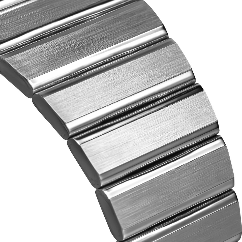 ケース表面はヘアライン加工が施され、光の当たり方によって繊細な放射線が浮かび上がる。一方でケースサイドはポリッシュ加工によって鏡面のような艶を放ち、異なる質感が絶妙なコントラストを生み出しています。