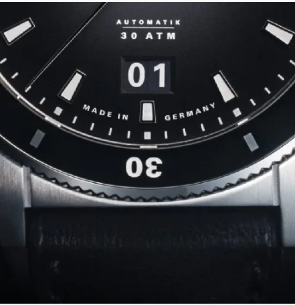 このムーブメントは高精度な時刻表示と、視認性に優れた大型日付表示を両立。自社開発のモジュール構造により、日付窓の位置をダイヤル上で柔軟に配置できる設計になっており、このモデルでは 6時位置 に配置。12時位置のMühleロゴおよび数字「12」とのバランスを取り、調和の取れた文字盤を実現しています。