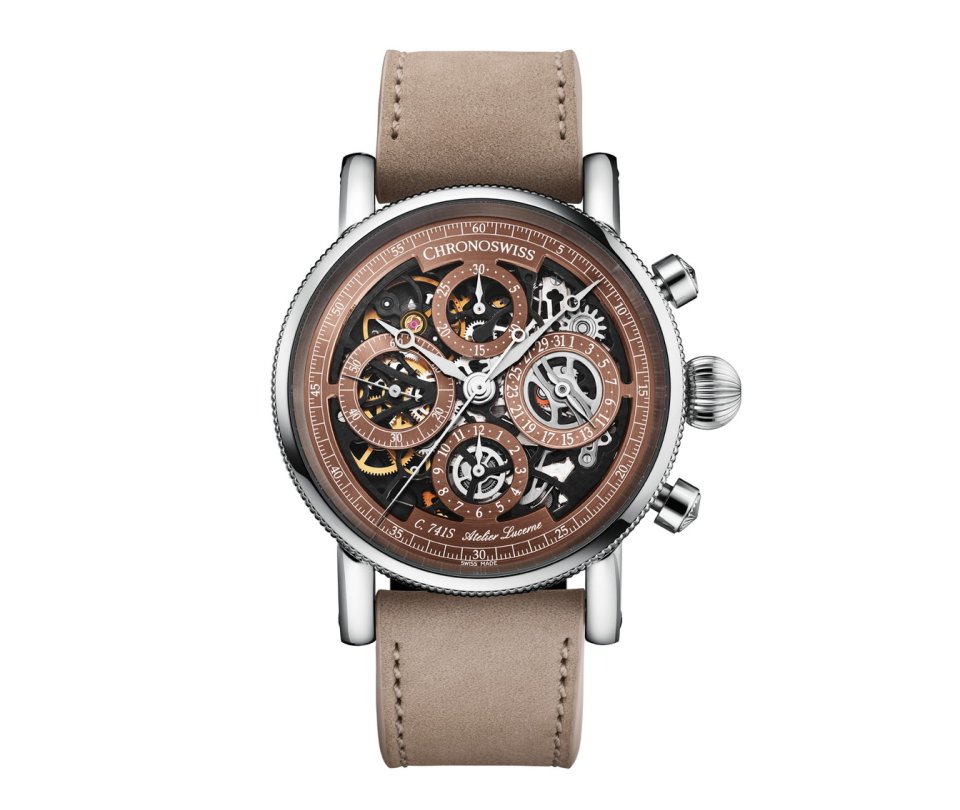 ムーブメントはガルバニックブラックで仕上げられ、完全にスケルトン化された自動巻クロノグラフキャリバーC.741Sが搭載されています。センターセコンド、30分積算計、12時間積算計、アナログ日付、スモールセコンドといったすべてが、アイコニックな3Dオープンワークのレイアウト内に配置され、すべてが目視できるようになっています。