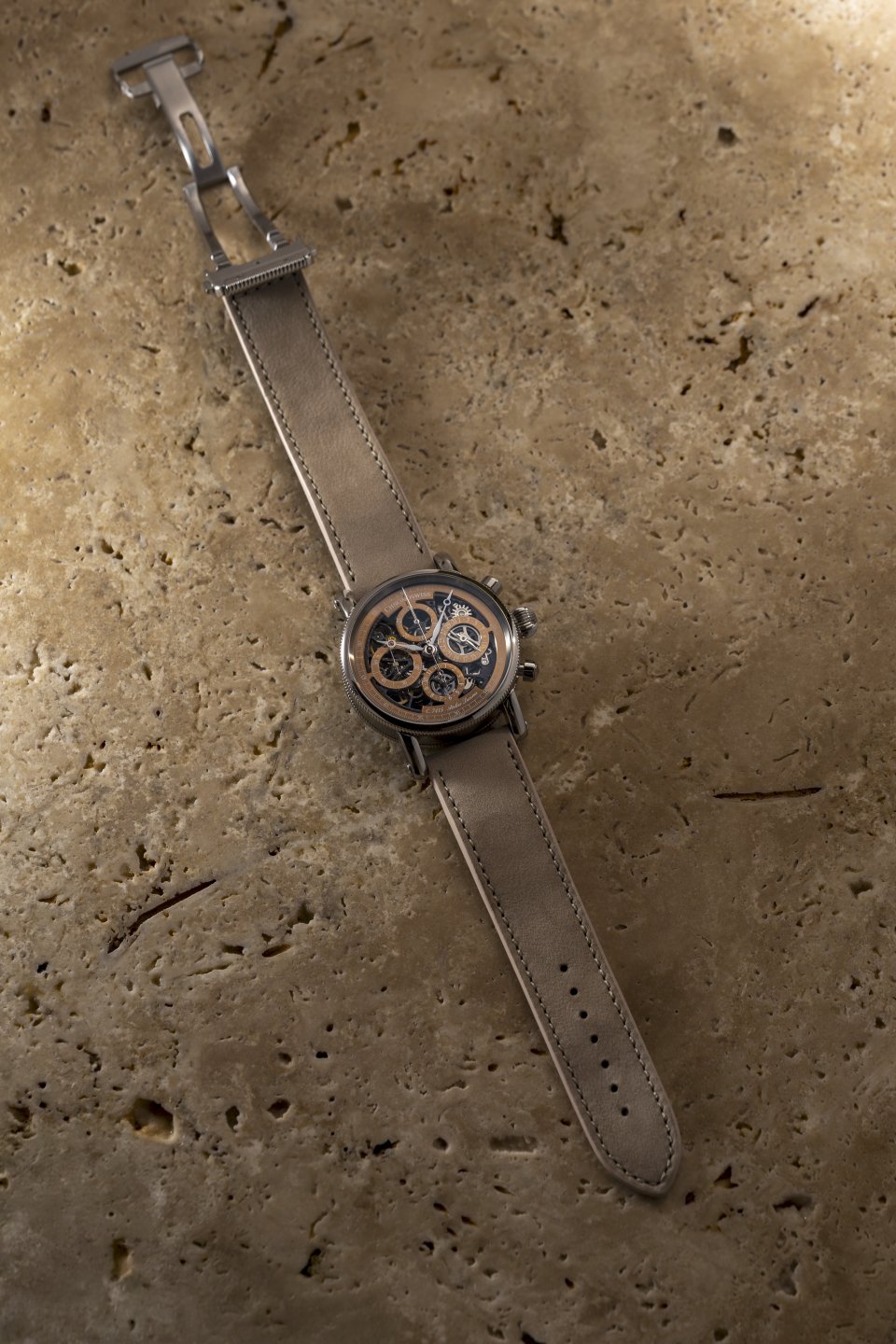 「オーパス ダカール」は、軽量で、耐久性に優れた41mmのグレード5チタンケースに収められています。CVDコーティングされたスケルトンブラウンの文字盤が温かさを放ち、その下にある開かれたメカニズムが、移ろう影と繊細な奥行きを生み出します。