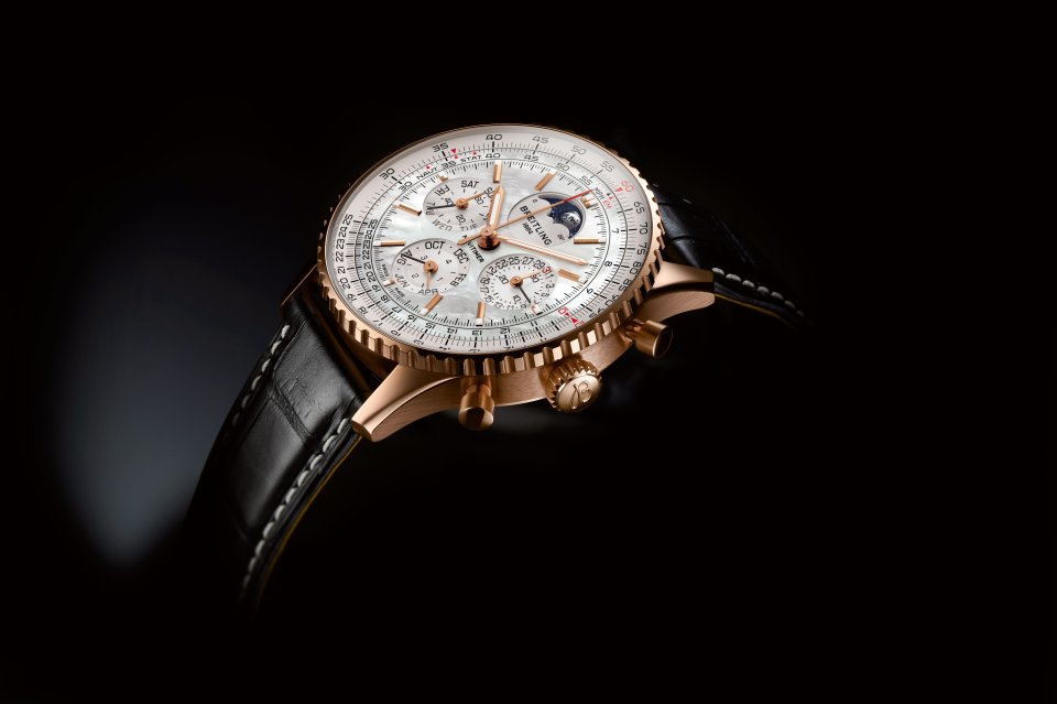 ナビタイマー B19 クロノグラフ 43 パーペチュアルカレンダー ジャパン リミテッドは、18Kレッドゴールド製43㎜ケースにマザーオブパールを文字盤に採用。天然由来だからこそ、一点ずつがそれぞれの煌めきを放ち、12時位置の精巧なムーンフェイズが美しく映えます。内蔵するコンプリケーション・ムーブメントのみならず、文字盤でもブランドのクラフツマンシップを感じられる最高峰のクロノグラフ。日本限定わずか20本、それぞれが唯一無二のタイムピースです。