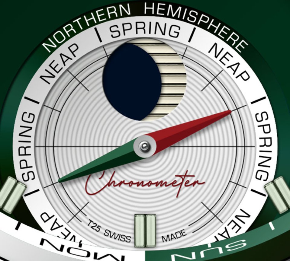 「オーシャン エクスプローラー」は、夢を追う人、挑戦を続ける人、そして既成概念にとらわれないアウトサイダーのために設計されたタイムピースです。その最大の特徴は、海と月のリズムを手元で直感的に把握できる潮汐表示機能にあります。