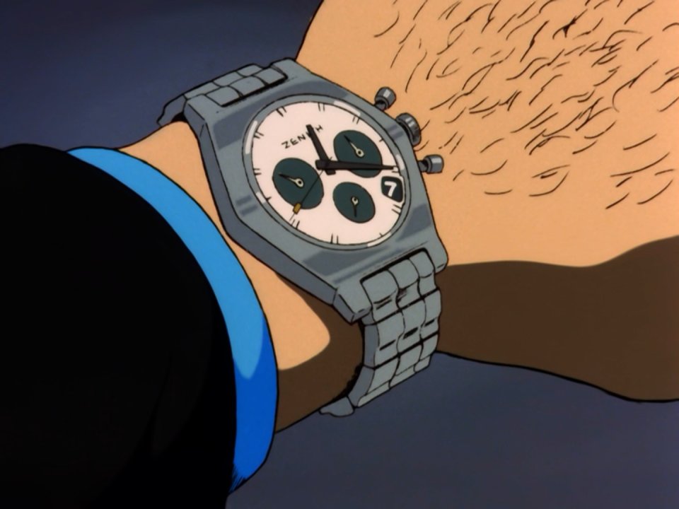 次元はアニメの中で、2度にわたりゼニスの時計を着用している姿で描かれました。その時計は明らかにA384をモデルとしていますが、アニメーターによる創作であり、実際には存在しないものでした。興味深いことに、初回はブラックの文字盤、2度目はシルバーの文字盤で登場しています。