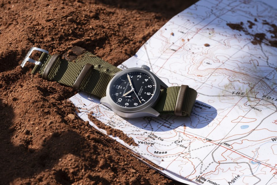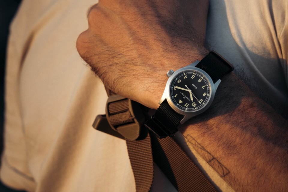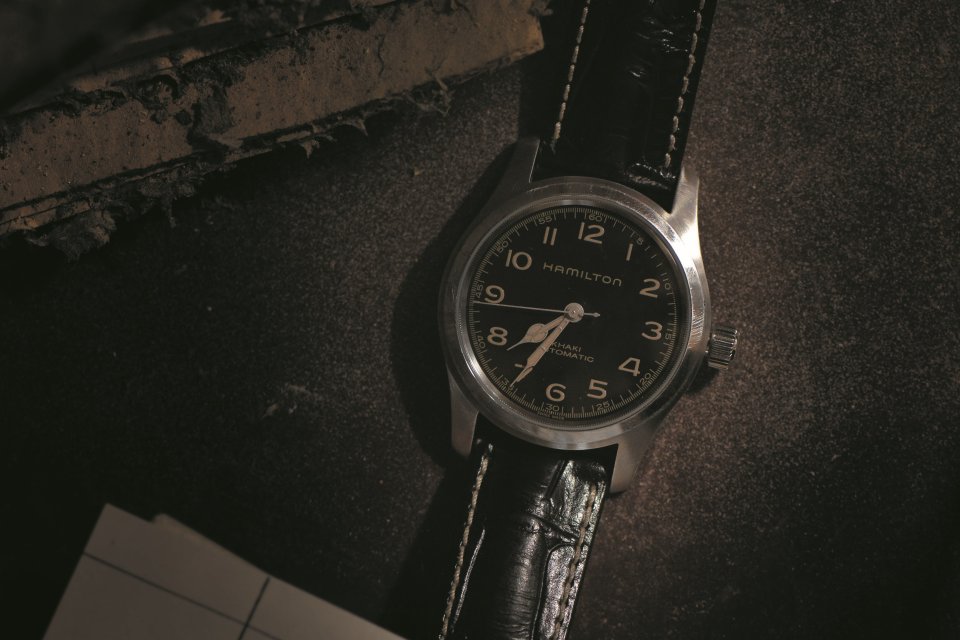1960年代に英国政府の非軍人向けに製造された「ハミルトンG.S.」をモチーフに誕生した「カーキ フィールド クォーツ」。正統性を受け継ぎながら、ファッションコーディネーションとしても楽しめるエントリーモデル。
