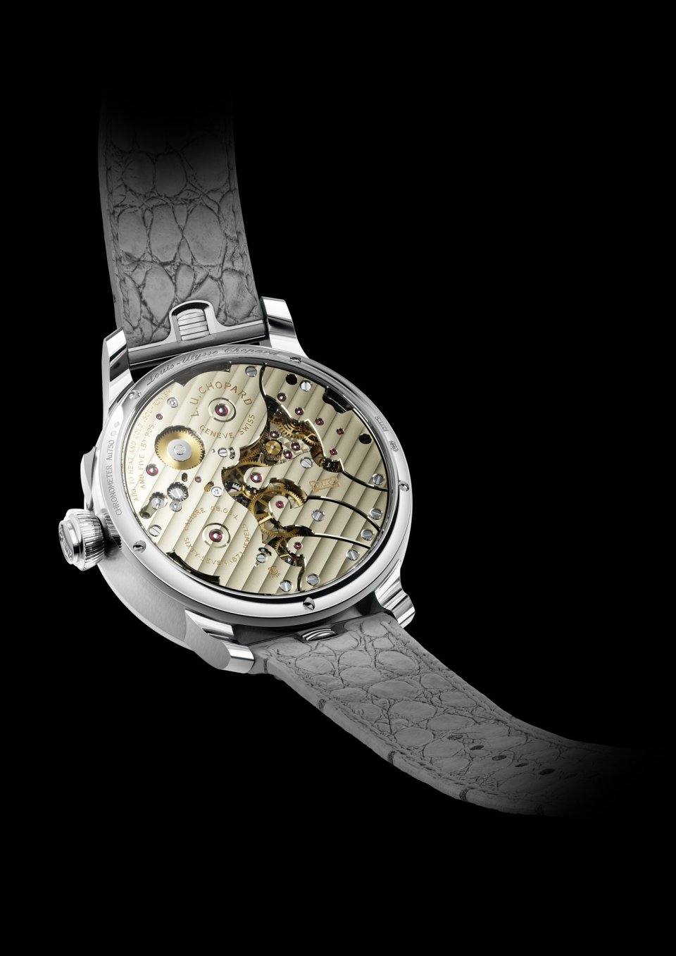 このタイムピースには、60秒トゥールビヨンを含む多彩なクロノメーター機能を駆動させるために、計686のムーブメント部品が使用されています。トゥールビヨンの上部にはスモールセコンドが配置され、このウォッチに搭載された計時精度を絶え間なく、しかしさりげなく表示しています。「L.U.C グランド ストライク」は、ジュネーブ・シールとCOSC(スイス公式クロノメーター検定局)のダブル認証を取得しており、その品質と精度が公式に保証されています。