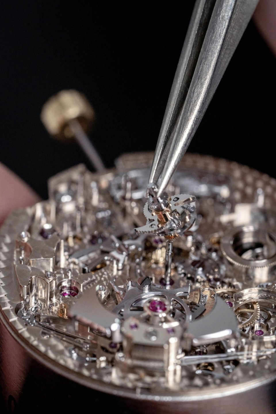 手動(ミニッツリピーター)または自動(グランソヌリ/プチソヌリ)でチャイムを作動させるたびに、34の部品が一斉に動き出し、正確かつ明瞭に時刻を告げます。これらの部品は、手作業による調整が施された板ばね(ブレードスプリング)によって制御され、待機状態から作動可能な状態に移るまでにかかる時間はわずか0.03秒です。これらのメカニズムは、舞台上でスポットライトを浴びるハンマーとゴングを支え、完璧な調和を見せるバレエ団のようです。作動準備が整った後に繰り広げられる“機械仕掛けの舞”では、レバーが下がり、カムが伸び、ラックが前進――そして、ついにハンマーがゴングを打ち、美しい音色が鳴り響く最高潮の“見せ場”を迎えます。