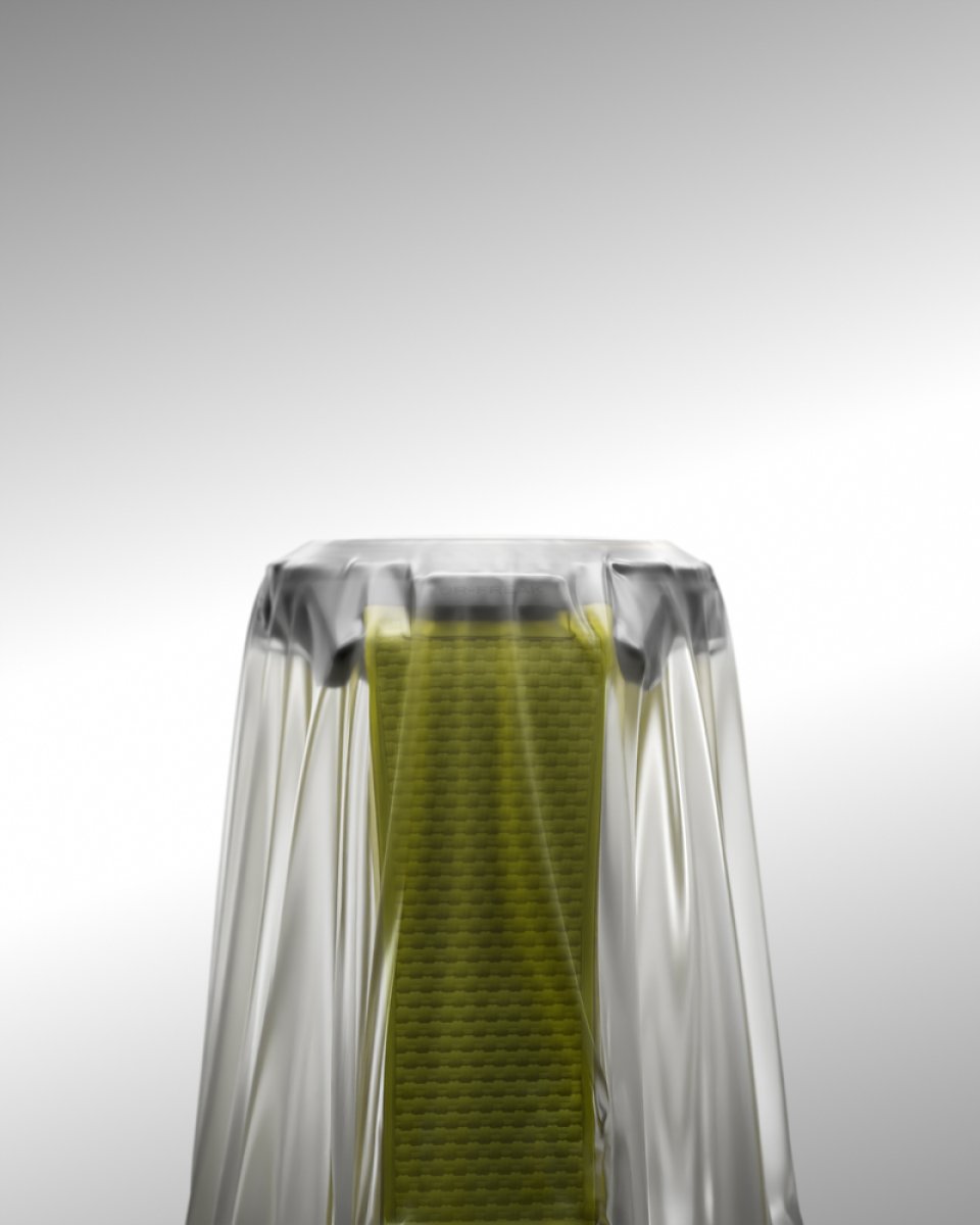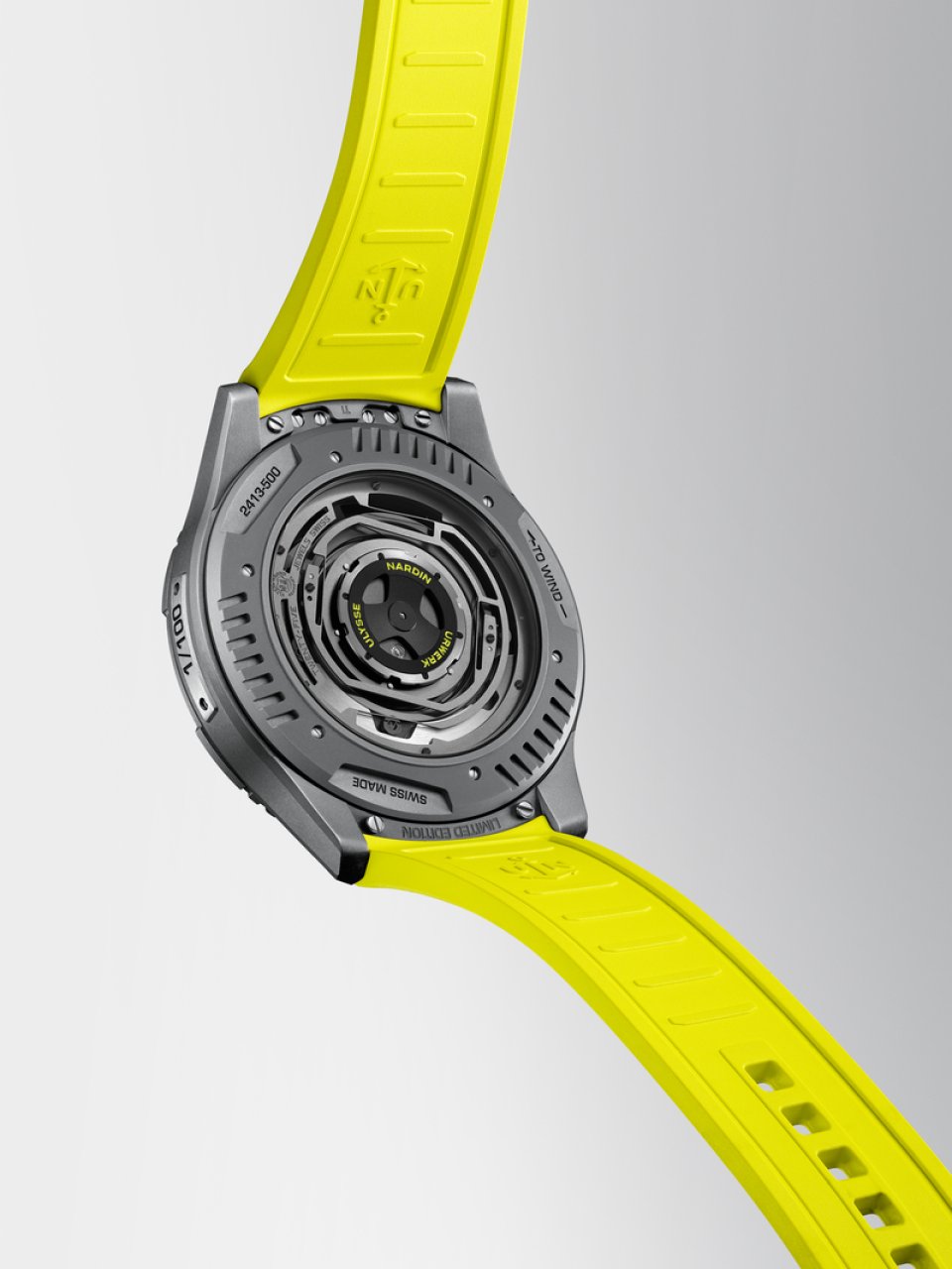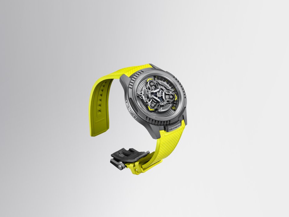 UR-FREAKは、幅44mmのユリス・ナルダン「フリークONE」のケースをベースに、ウルベルク特有の深みのあるアンスラサイトグレーカラーのサンドブラスト加工を施したチタンを採用しています。このベースに、ウルベルクを象徴するデザイン要素が加わり、作品の魅力をさらに高めています。例えば、チタン製の回転ベゼルとケースバックには、ウルベルクの特徴的なデザイン要素である3箇所のフルーテッド加工が施されています。さらに、チタンの色合いにアクセントを加えているのは、ウルベルクを象徴するエレクトリックイエロー(Pantone 395 C)です。この鮮やかな色が、サテライトポインター、インデックス、そしてビスポークフィットのラバーストラップを引き立てます。