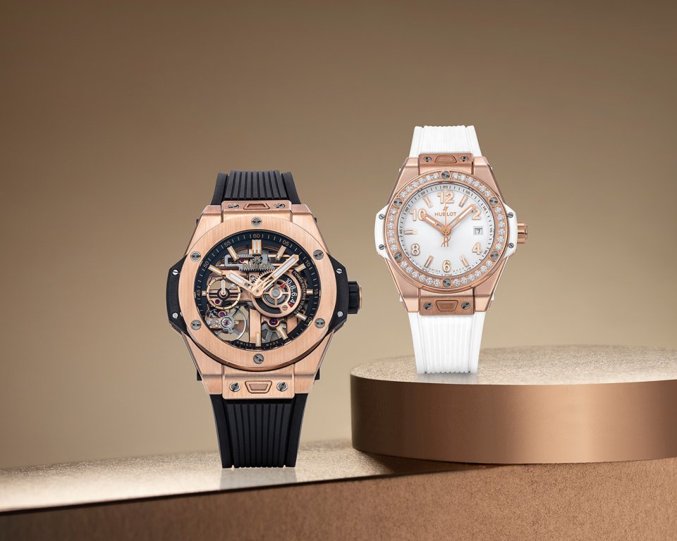 HUBLOT 「ビッグ・バン メカ-10 キングゴールド」左、「ビッグ・バン ワンクリック キングゴールド ホワイト ダイヤモンド」右