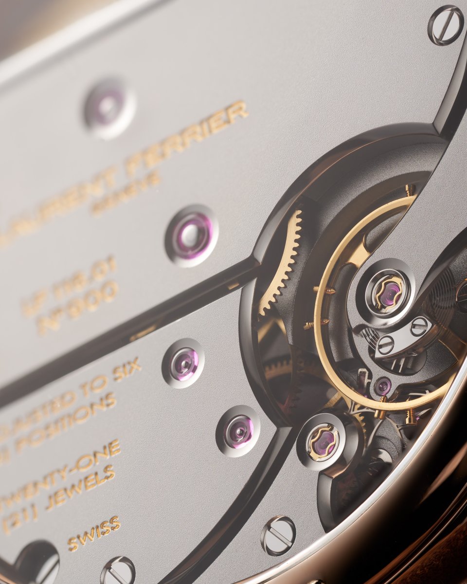 キャリバーLF116.01はブランドの中で複雑機構を備える他のムーブメントよりシンプルですが、細部に緻密に施された仕上げは全く同じ基準を維持しています。サンドブラスト加工が施されたブリッジにはブラックロジウム仕上げが施され、それぞれのエッジは手作業で研磨されています。対照的に、鏡面研磨されたネジがきらめく輝きを見せます。手作業で仕上げられた脱進機ブリッジの内角を含む全体の仕上げは、ブランドの職人の忍耐強い技術力を示しています。部品は1つひとつが工房にて手作業で仕上げられます。目に見えないものといえども、偶然に委ねられるものは一切ありません。