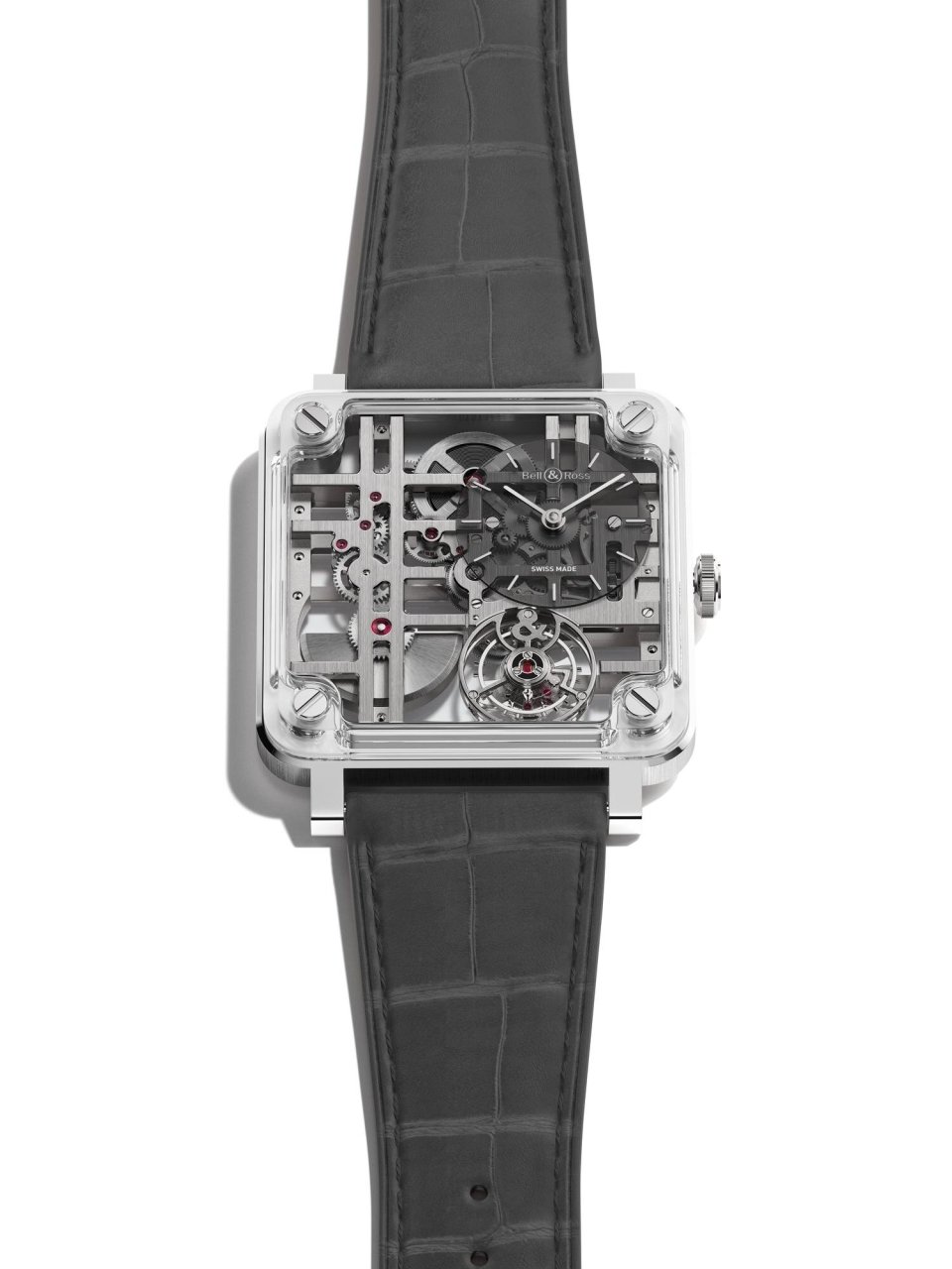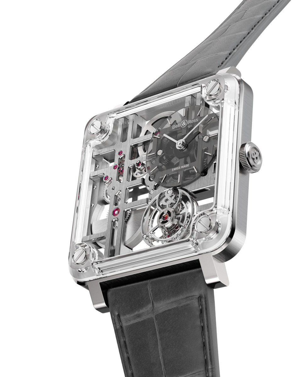 ベル&ロスの象徴であるスクエアケースは、ここで大胆に変化します。この新しい解釈では、スティールとサファイアを組み合わせて、完全な透明性とミニマリズムを備えた構造を実現しています。すべての要素がムーブメントを際立たせる役割を果たしています。