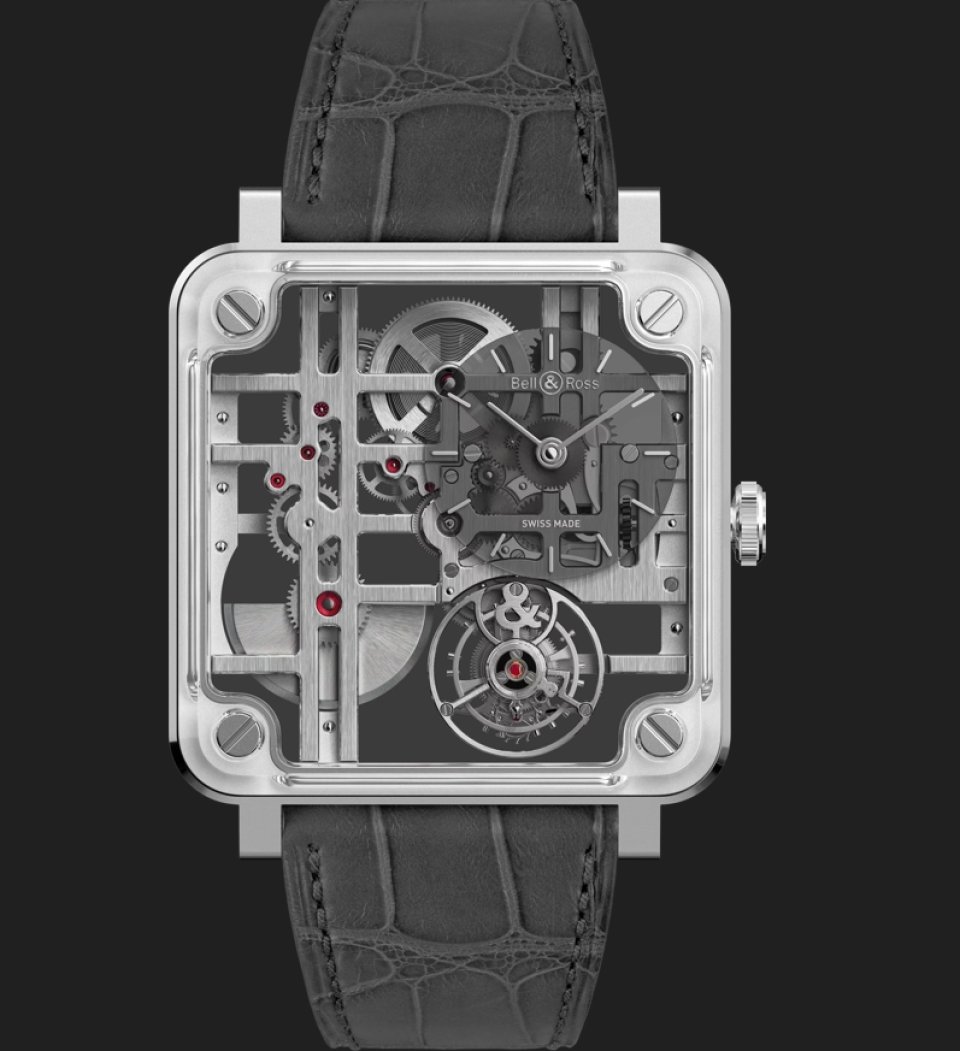 ムーブメントの構造は、ベル&ロスが大切にしている幾何学的なグリッドを反映しています。水平と垂直の直線が機械的な空間を厳格に分割し、スクエア型のスケルトンがケースと呼応して、外側と内側の間に視覚的な連続性を生み出しています。26個のルビーは、伝統的な時計製造の証として、このジオメトリーに深紅の輝きを添えています。
