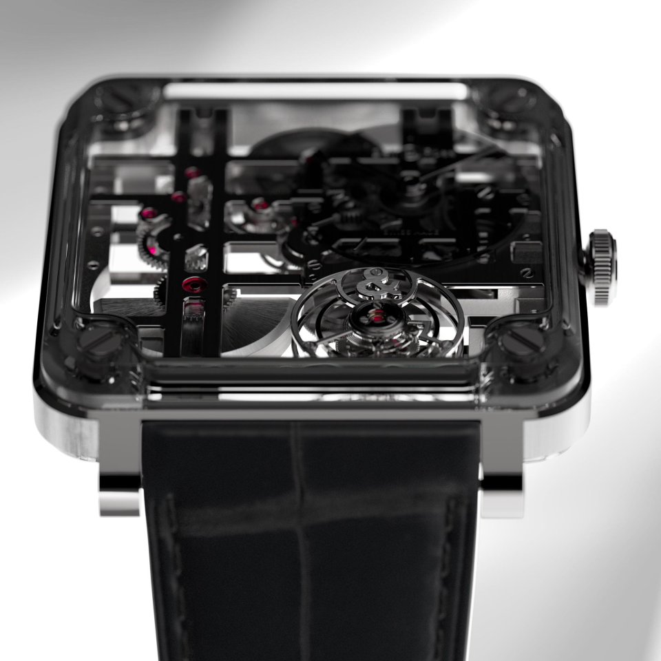 「時刻表示は最もシンプルな表現に還元されています。ムーブメントもまた、余分を排し、グリッドを尊重しています。」と、ブルーノ・ベラミッシュはまとめています。実際、表示されるのは時と分のみで、2時位置にオフセットされています。この意図的な簡素化によって、機械構造のための空間が解放され、時間は二次的なものとなっています。