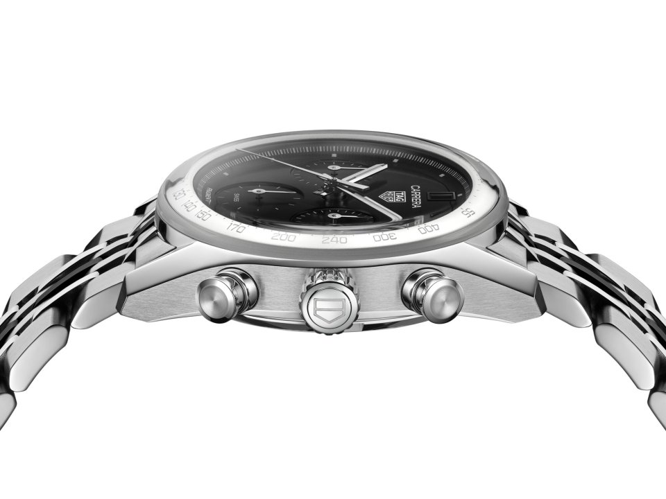 ブレスレットは、往年のスタイルを踏襲し、今年初めに復活したタグ・ホイヤーの7連のビーズオブライスブレスレットを採用。ただしセンターリンクにはブラック PVDコーティングを施すことで、コントラストを効かせることでブレスレットにも独特の表情を持たせています。