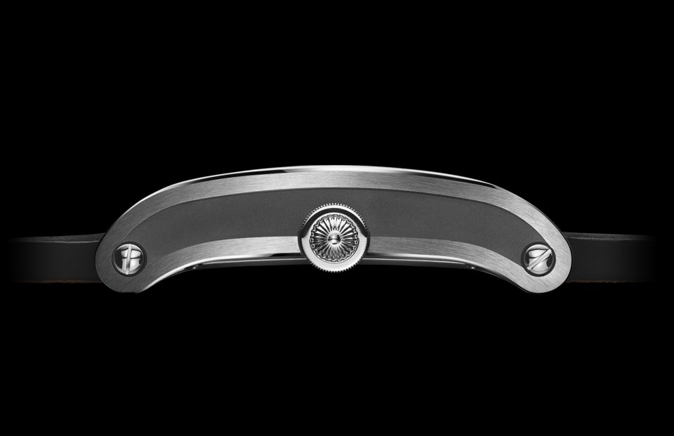 ケース側面のサンドブラスト加工が、構造的な幾何学に軽やかさとコントラストを添えています。リューズは、伝統的なオニオンクラウンを現代的にアレンジし、伝統と革新を実現しました。