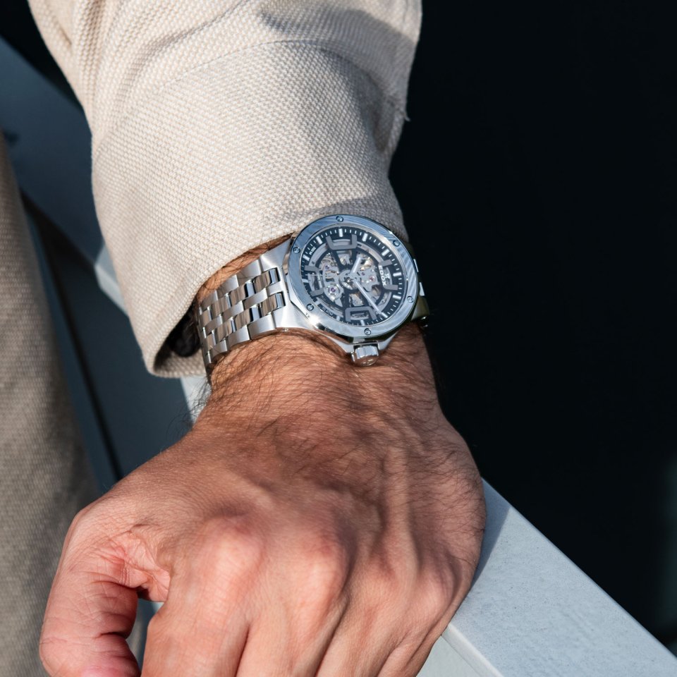 ケースは細かい筋目のヘアラインと鏡のような光沢を放つ鏡面仕上げを使い分け、ブレスレットもヘアラインをベースにリンクパーツのみ鏡面仕上げでメリハリを演出。各部の仕上げを丁寧に使い分けることで、シンプルながら奥行きと洗練を宿すモダンな佇まいです。