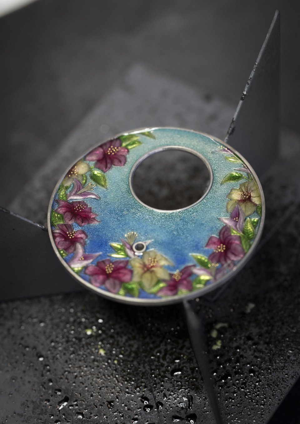 花はレッドから太陽のようなイエロー、鳥の羽根は繊細に移り変わるホワイト、空は 6 時位置のマリンブルーから 12 時位置の天頂を思わせる明るい色調へと、大胆でありながら深みのある緩やかなグラデーションに高度な職人技が見て取れます。この見事な色合いはすべて「グラン・フー」エナメル(高温焼成エナメル)の伝統に従って複数回窯で焼成することで得られます。リスクの高い作業で、焼成時間が長すぎたり、温度が高すぎたりすると、それまでの作業がすべて無に帰し、最初から作り直さねばなりません。