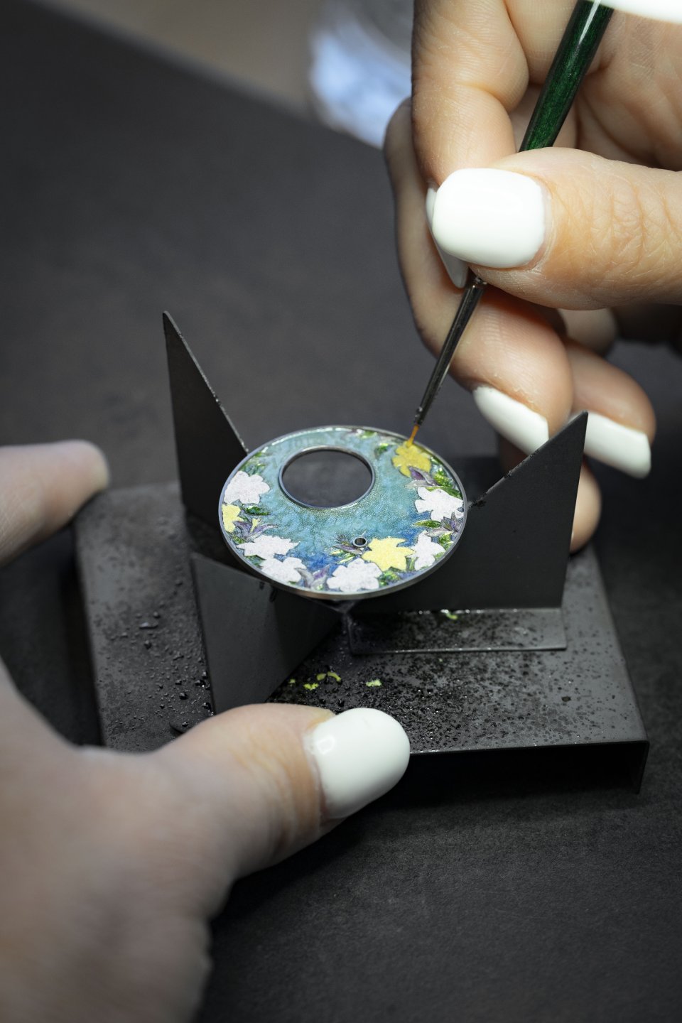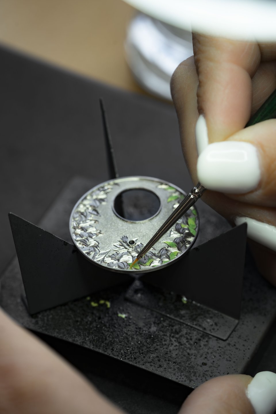 文字盤も 18K ゴールド製で、金箔を用いた花粉のようにきわめて細かいディテールに至るまですべて手作業で仕上げられています。花、葉、鳥のエングレービングを施してから、手作業によって色とりどりのエナメルで着色しました。生き生きとした鮮やかなカラーを厳選し、時にはたった一筆で無限かつ繊細なニュアンスを表現しています。