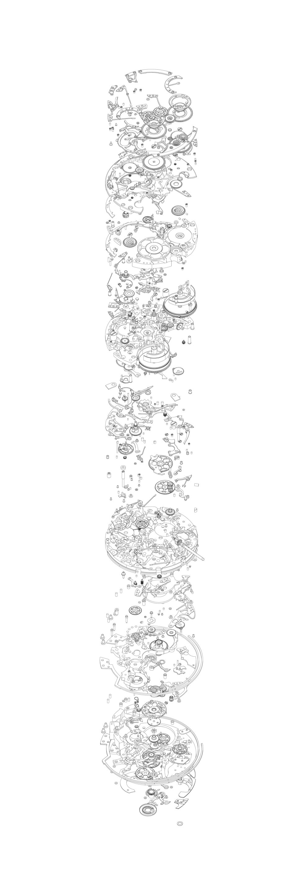 ,200の設計図、開発途中で生み出された21の特許(内、13はムーブメントに搭載)、1,053個の部品(総部品数1116個)を含む8年間のプロジェクトであり、設計、組み立て、装飾は全て自社で行われています。
