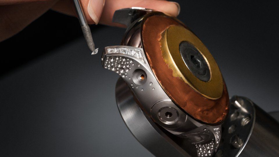 ジェムセッティングは特に複雑で、複数の技法を組み合わせています。ケースの平面部分にはバゲットカット ダイヤモンドをレールセッティングであしらっています。表側のベゼルには2列、裏面のベゼルには1列を配し、さらにラグの上部とフォールディングクラスプにもダイヤモンドが輝きます。ミドルケースとラグに施したスノーセッティングは、直径の異なるブリリアントカット ダイヤモンドをランダムに見えるよう敷き詰めることにより、メタルの見える部分を最小限にしながら、ほぼ継ぎ目なく全体を煌めきで覆っています。