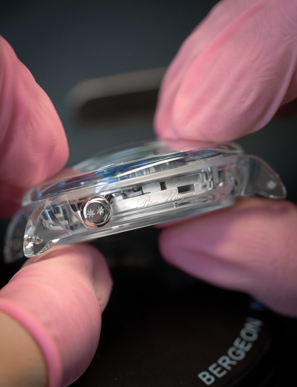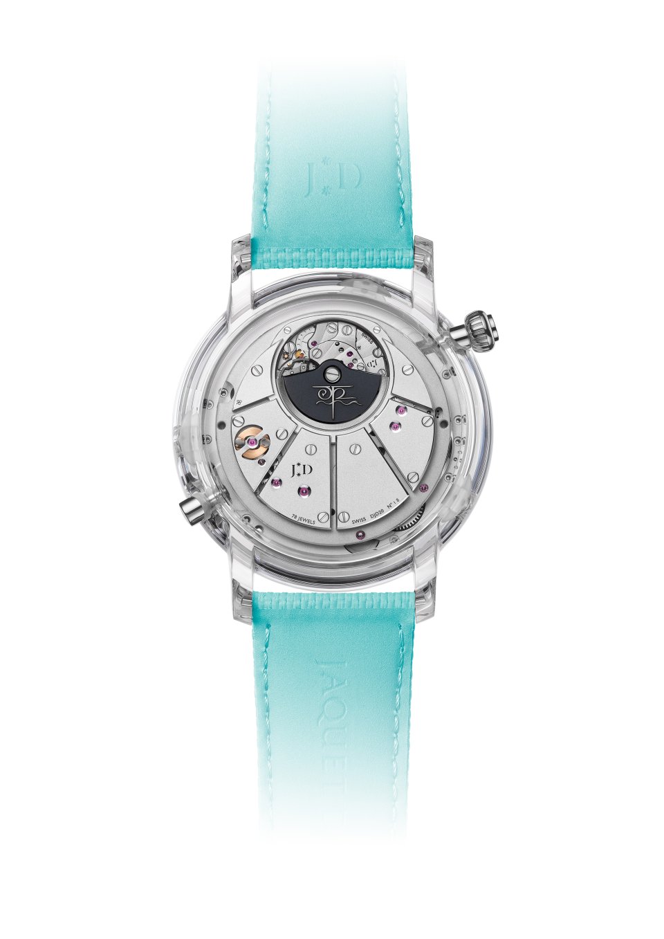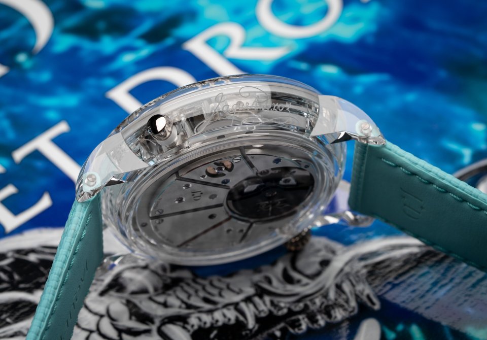 もうひとつ、成長した結晶を用いたサファイアケースにも鉱物素材が用いられています。オパールのきらめくブルーと、オニキスの漆黒に対し、こちらは完全に透明です。外部の部品なしで確実に密閉する独自のケーシング方法により、ネジもインサートも使用しない高級時計ではおそらく唯一のケースで100%スイス製ケースです。この偉業により、純粋性を損なうことなく全体が光で満ちあふれた時計が誕生しました。