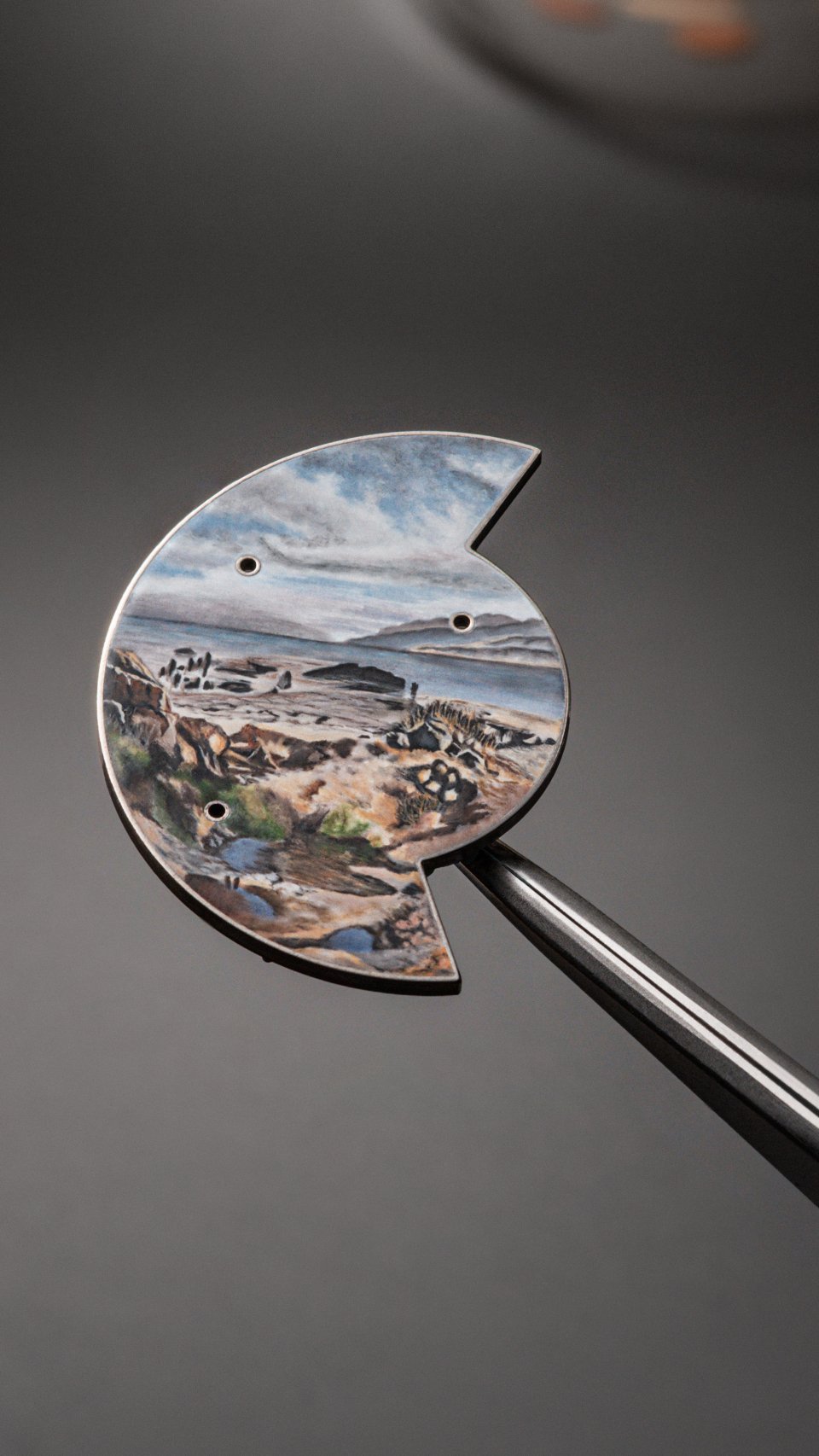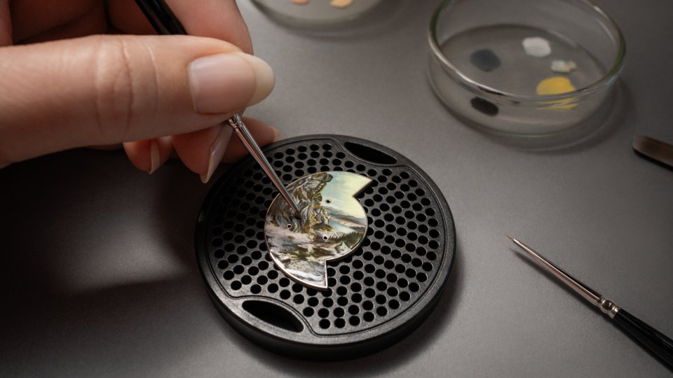 まず、18Kホワイトゴールドのベースに、ホワイトとオパール調のエナメルを5層重ねて煌めきを生み出し、その上に空、水、大地を描きます。エナメルは1層ごとに、極度の高温で焼成します。続いて、繊細な色のバリエーションを駆使して風景を描きます。岩、植物、雲の形状は細部まで緻密に描き、計10層のエナメルを重ねて仕上げました。