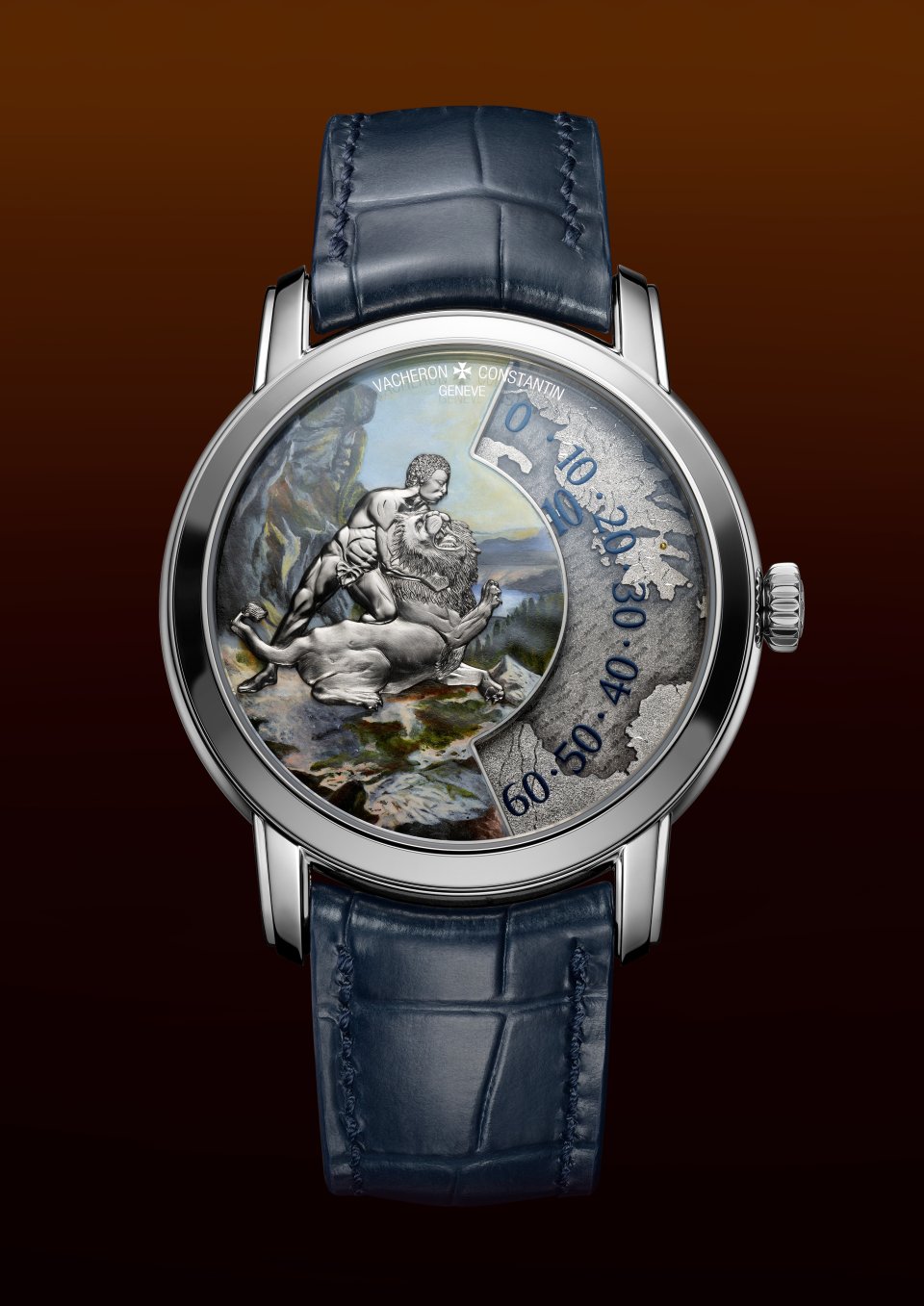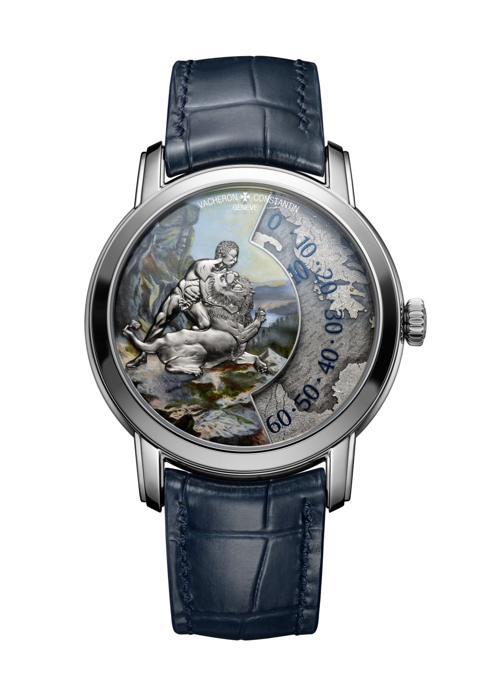 後に、ヘラクレスは獅子の毛皮からマントを作り、身を守る手段として、また勇気の象徴として生涯これを纏いました。本作では、ミニアチュール・ペインティングのエナメルの色彩を、ダークブルーのアリゲーターストラップが引き立てます。