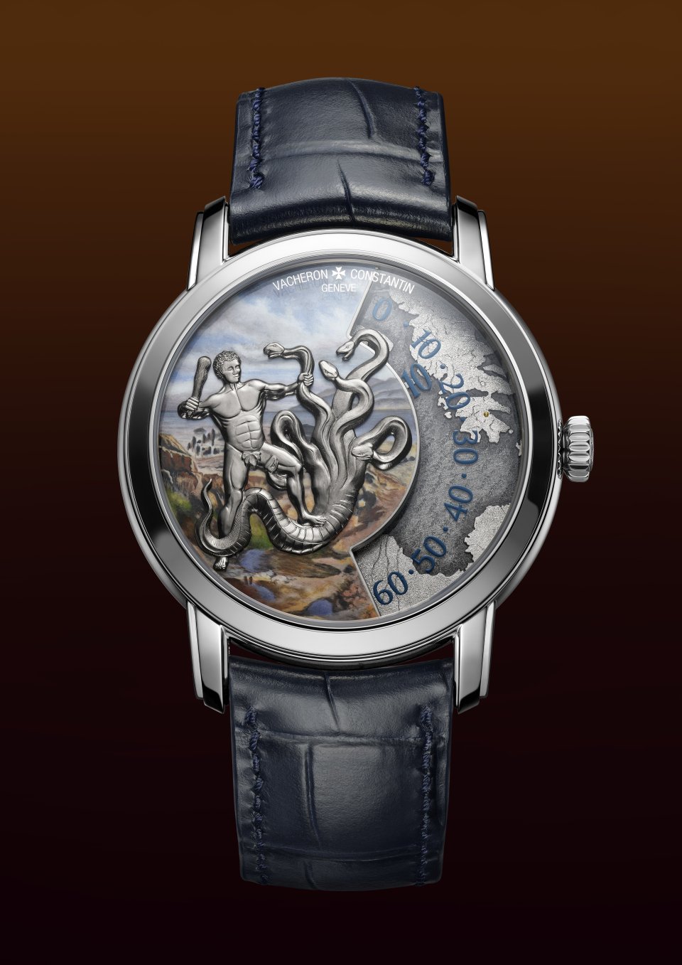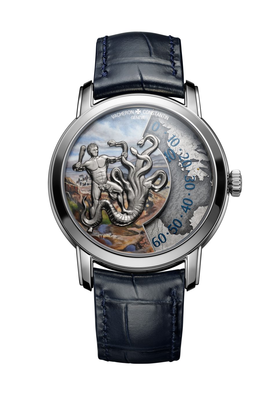 そして、ヘラクレスはヒュドラの毒入りの血を矢じりに塗りました。本作では、ミニアチュール・ペインティングのエナメルの色彩を、ブルーのアリゲーターストラップが引き立てます。