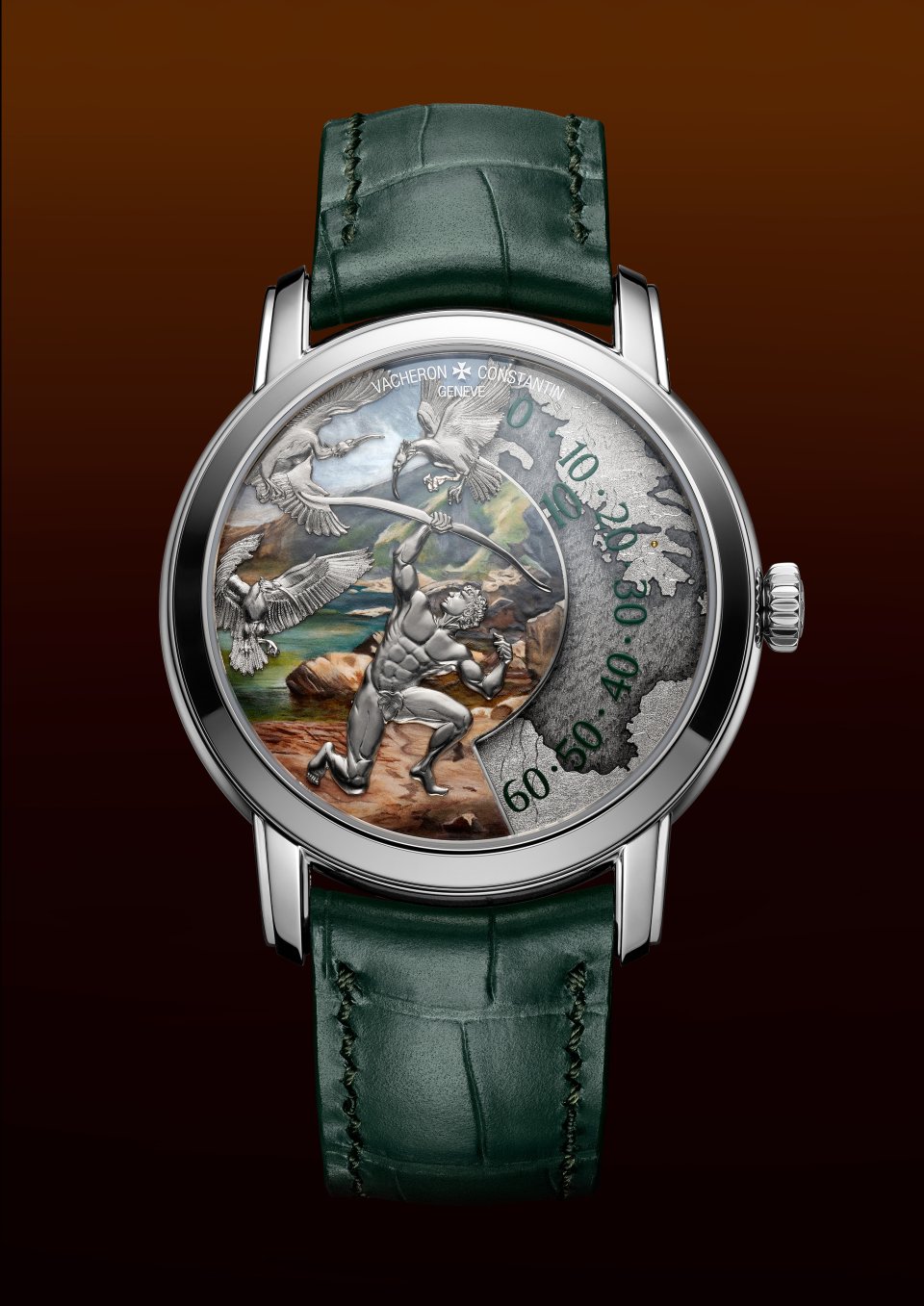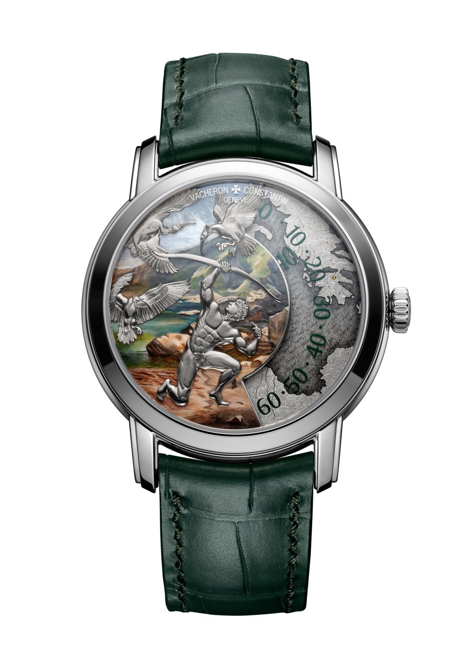 鳥たちが驚いて飛び立つと、ヘラクレスは先の功業で倒したヒュドラの毒血を塗った矢を放ち、鳥を射落としました。本作では、ミニアチュール・ペインティングのエナメルの色彩を、グリーンのアリゲーターストラップが引き立てます。